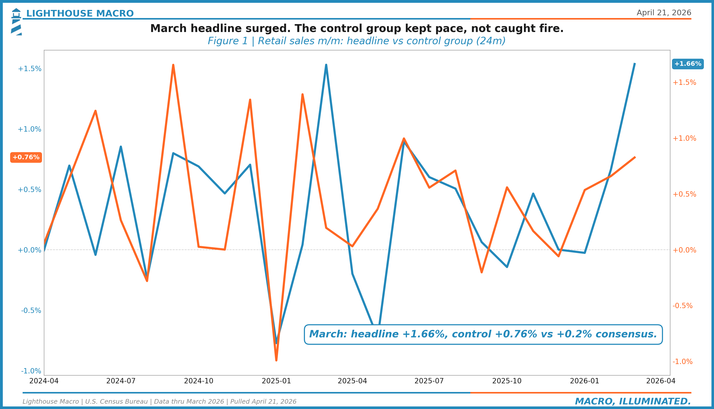 March retail sales rose 1.66% month over month, the biggest monthly gain in more than a year, and twelve of the report’s thirteen categories were green. The control group, the measure that feeds directly into GDP, climbed 0.76% against a 0.2% consensus. Bloomberg ran it as broad-based resilience. Benzinga ran it as consumers shrugging off the pump shock. The tape bought the number early, then gave most of it back into the close.