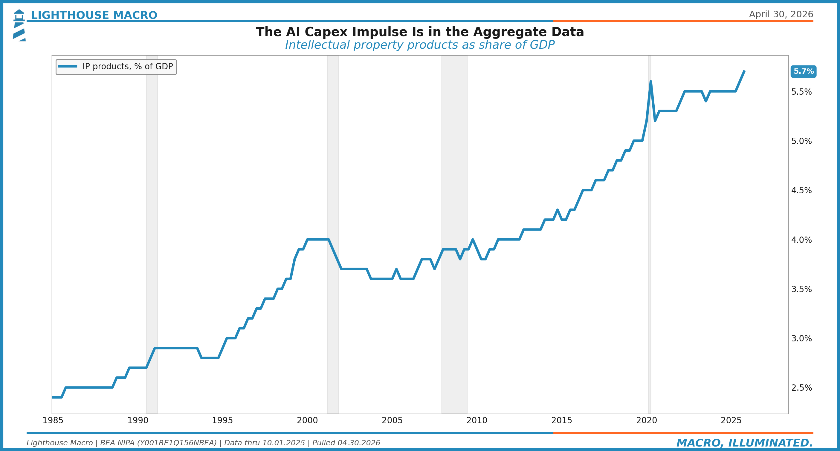 Inside investment, the split sharpens further. The BEA flagged increases in equipment, intellectual property products, and private inventory, partly offset by decreases in residential and nonresidential structures. That decomposition is itself the AI capex fingerprint. Equipment and IP products are where information processing hardware and software live in the national accounts. Structures are everything else the investment economy traditionally builds. One side accelerated. The other rolled.