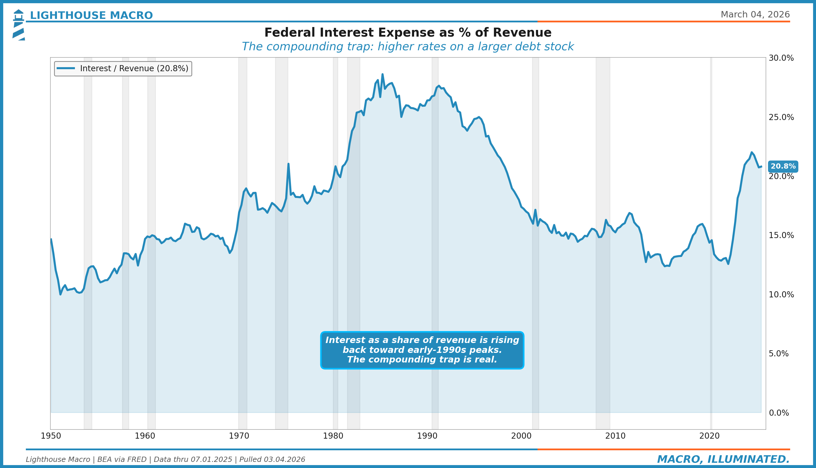 This is where the math gets uncomfortable. On an annualized basis, federal interest payments now consume roughly 21% of revenue. That means more than one in five dollars the government collects goes straight to servicing existing debt. Not building roads. Not funding defense. Not paying Social Security. Just interest.