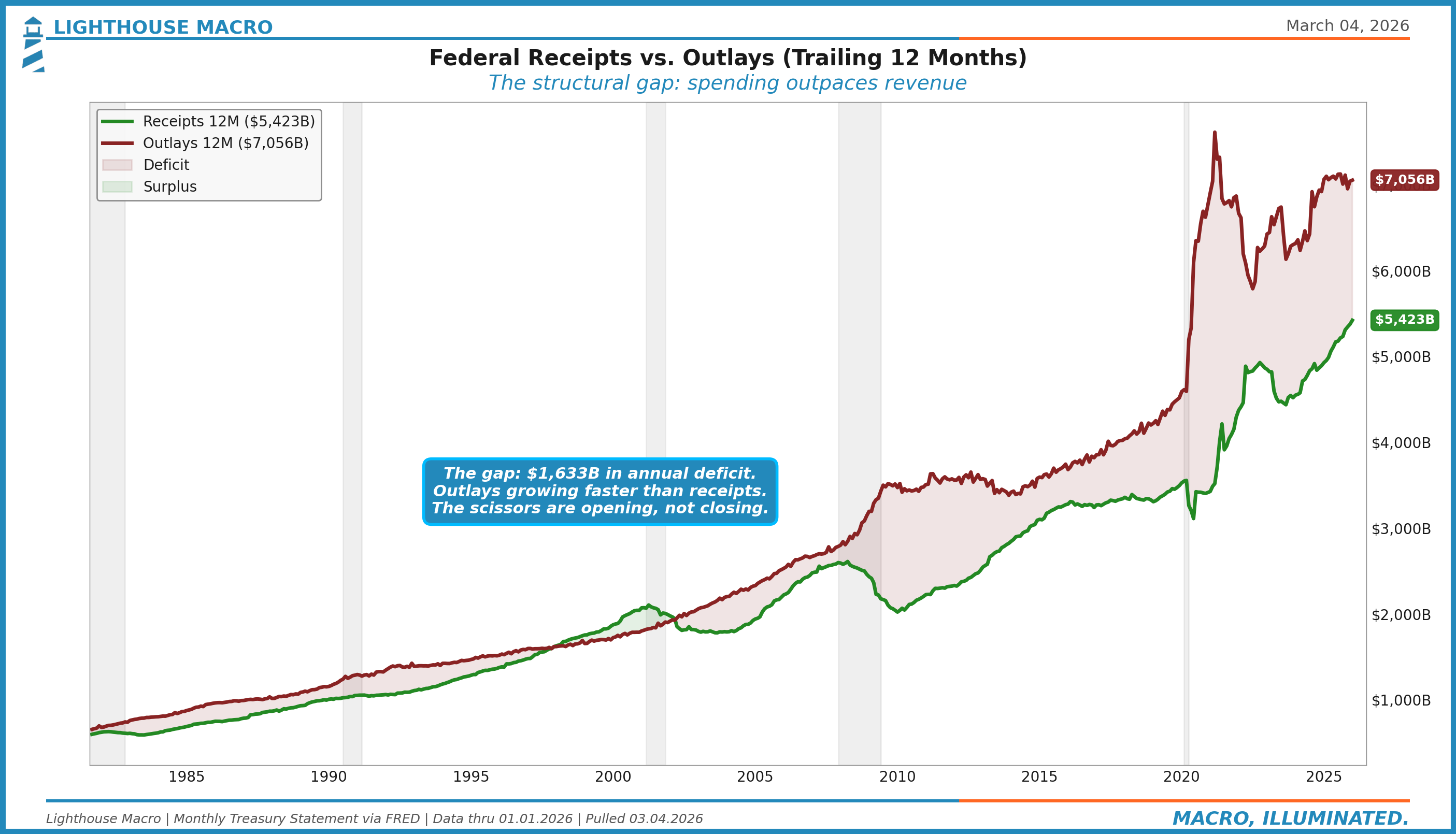 The cleanest visual of fiscal dominance is simply plotting what the government collects against what it spends. The gap between receipts and outlays is the deficit. When that gap widens persistently outside of recession, you are looking at a structural problem.