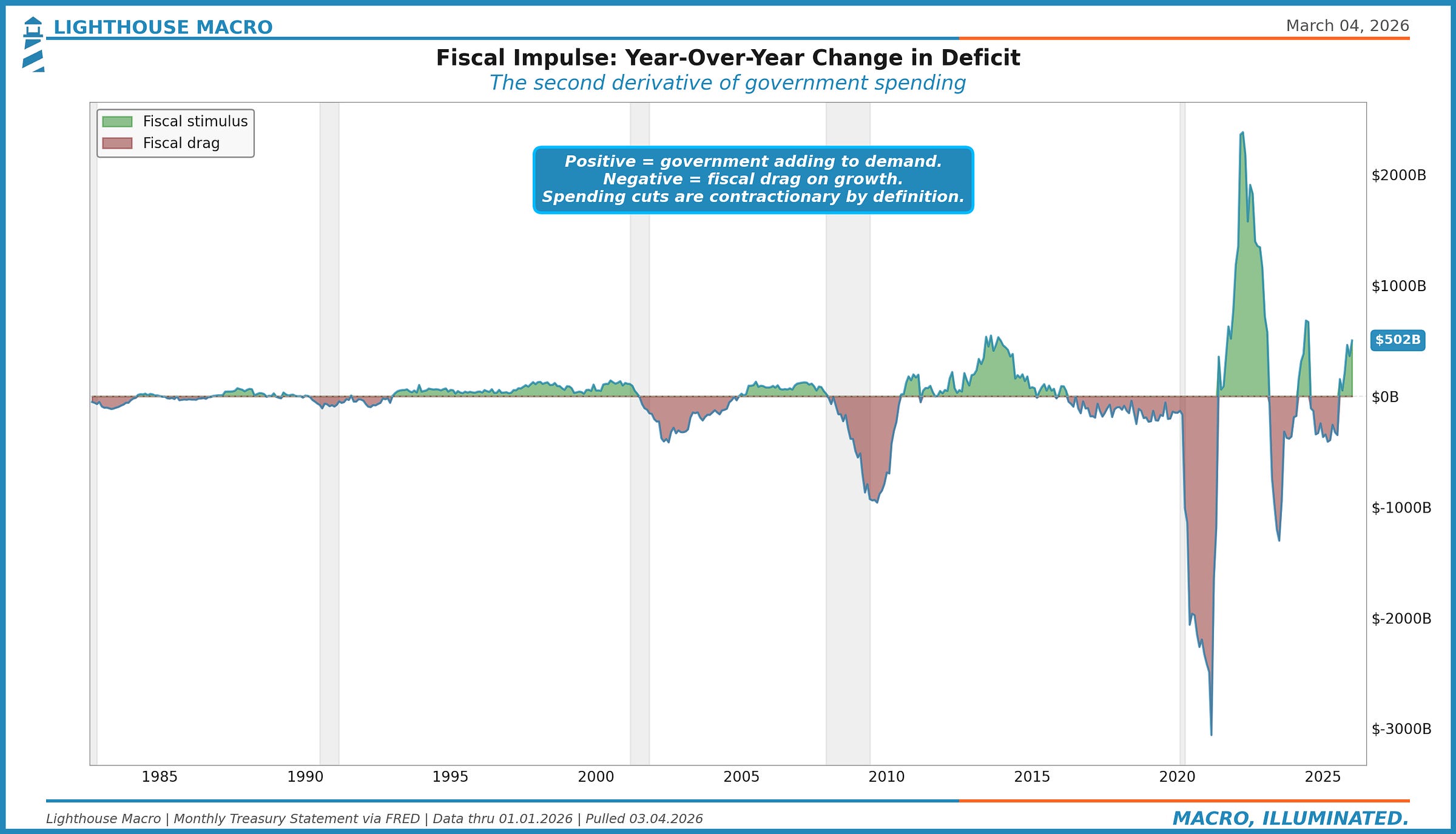 On a trailing 12-month basis through January 2026, the fiscal impulse is positive at roughly $502 billion, meaning the government is running a larger deficit over that window than the prior 12 months. For context, outside of the 2020-2021 emergency spending ($3-4 trillion swings), a $500 billion impulse is among the largest in modern history. Note: on a full fiscal year basis, FY2025 ($1,776B deficit) actually narrowed slightly from FY2024 ($1,828B), so the impulse reading depends on the measurement window. The trailing 12-month measure captures the most recent direction. For the framework, this creates a tension: if spending reforms actually materialize, the fiscal impulse turns negative, and that reversal hits GDP growth directly.