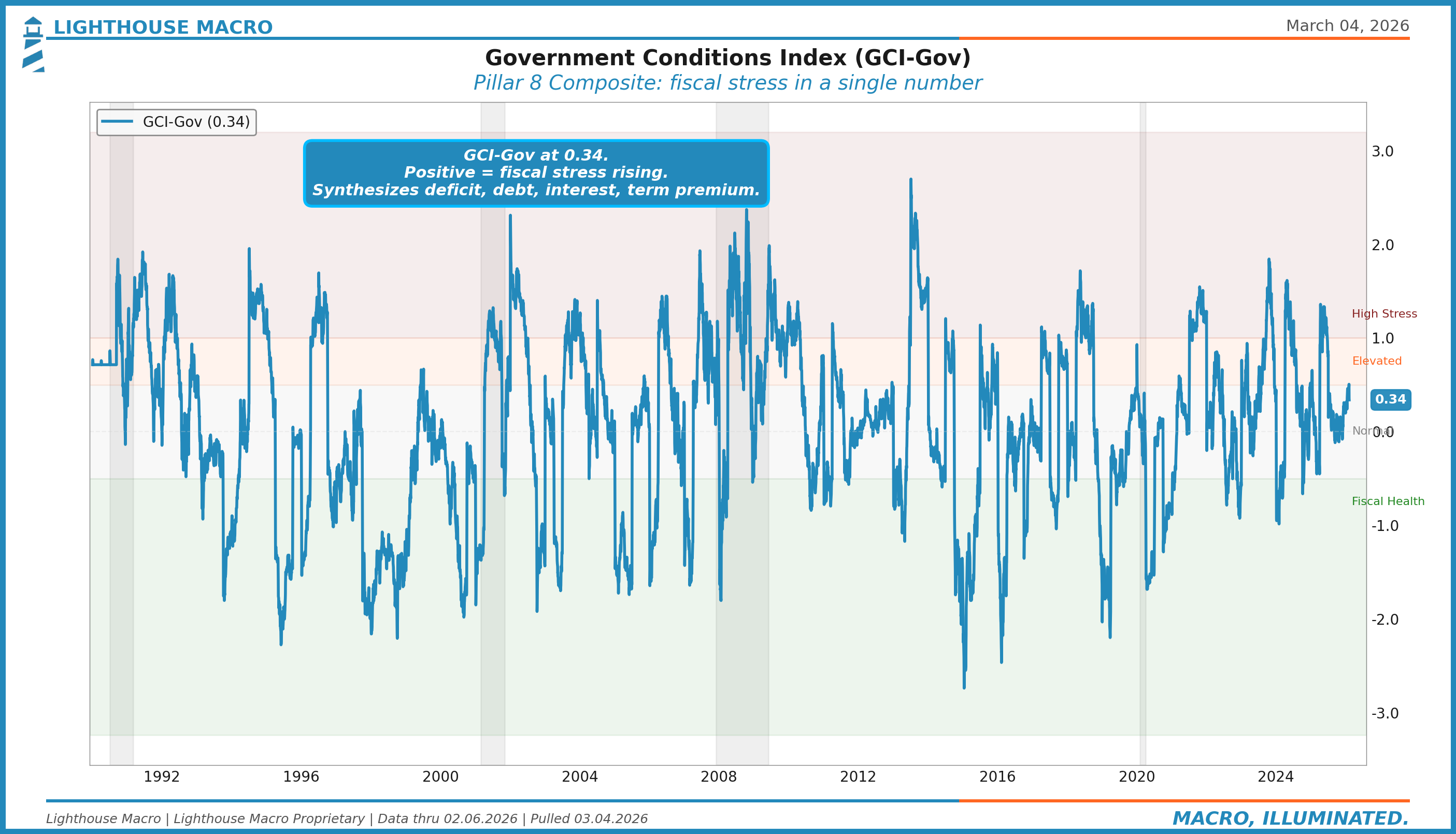 The Government Conditions Index synthesizes the indicators above into a single composite reading. Positive values indicate rising fiscal stress. Negative values indicate improving fiscal conditions.