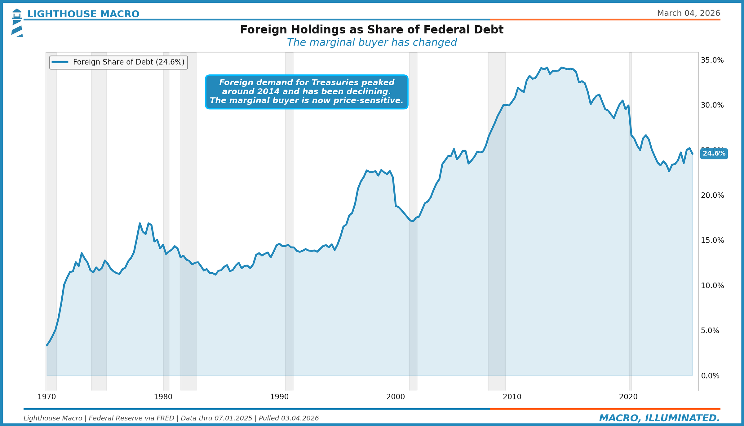 The share of gross federal debt held by foreign investors peaked around 34% in 2013-2014 and has been declining steadily. At 24.6%, foreign governments and institutions hold a smaller share of a much larger debt stock. The absolute level of foreign holdings has grown, but not nearly as fast as total issuance.