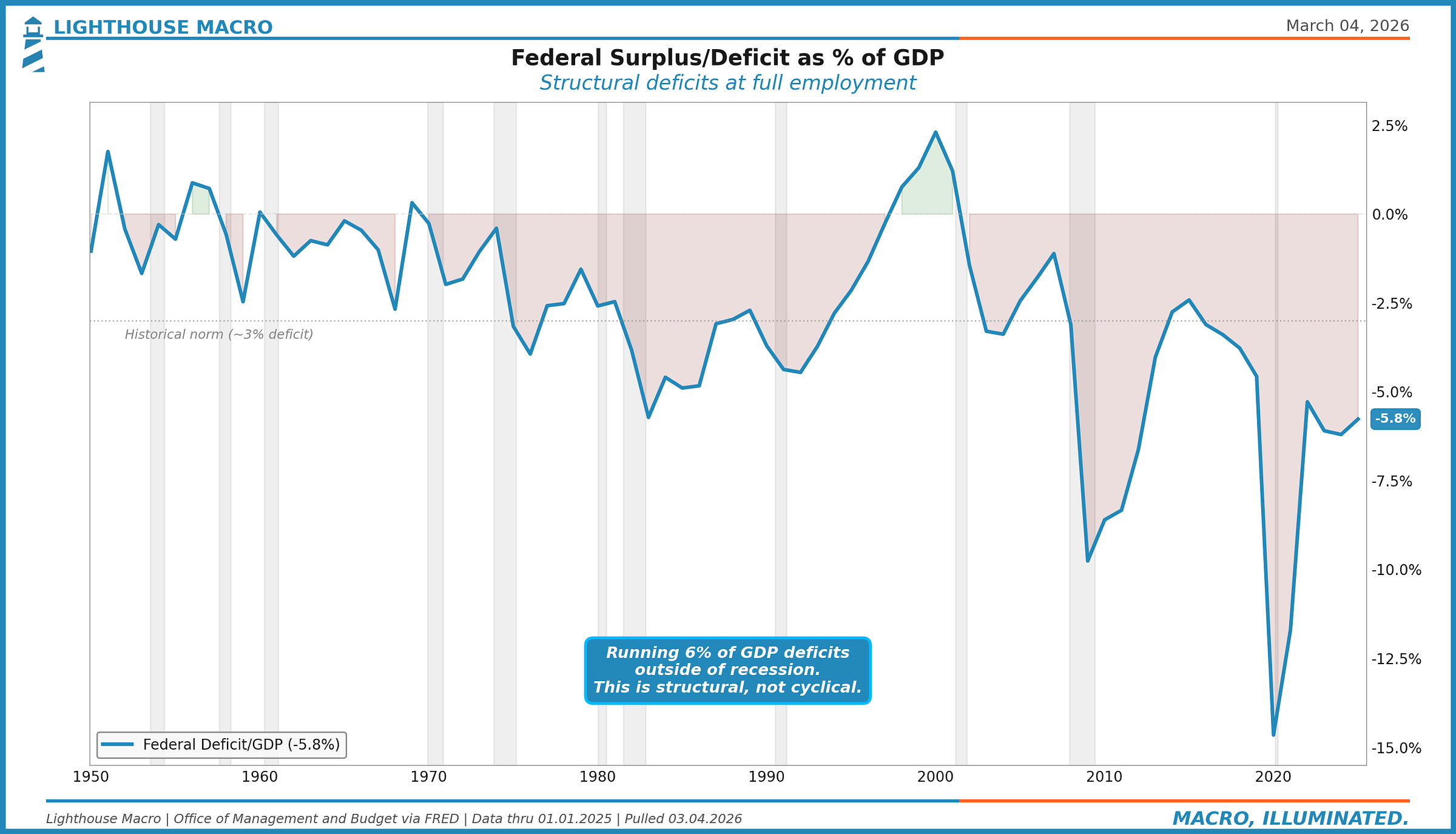 The current deficit at 5.8% of GDP is running at levels that used to require a recession to produce. The 2020 spike to -15% was an emergency. The persistence at -6% to -7% in 2023-2024 was not. This is the government spending more than it collects on a structural basis, driven by mandatory spending growth, elevated interest costs, and no political appetite for correction on either side.