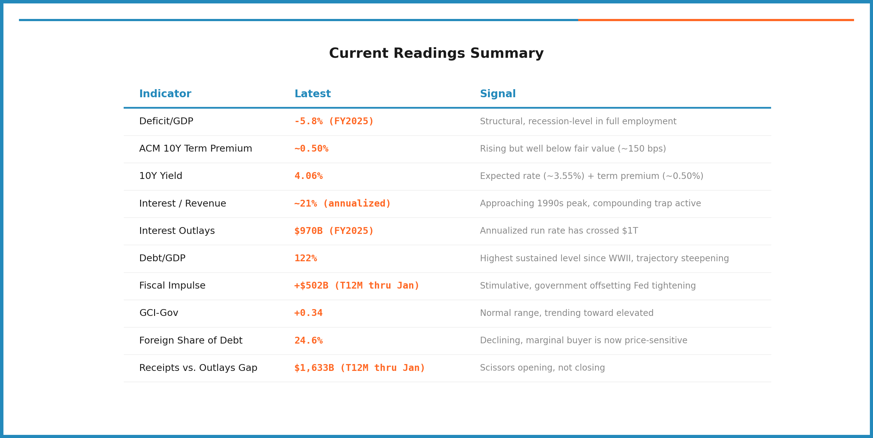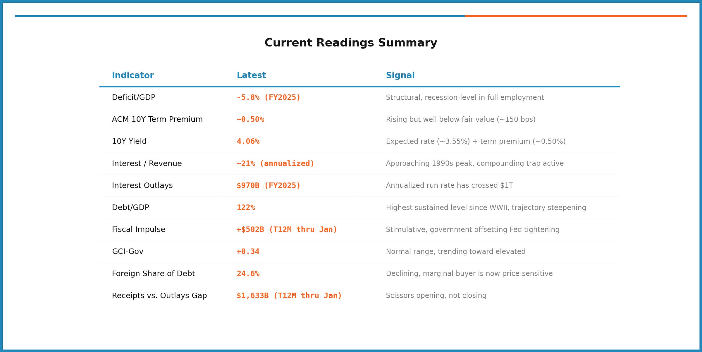 The deficit level tells you about structural dependence. The deficit trajectory (fiscal impulse) tells you about the growth impact of changes. Term premium tells you whether the market has noticed. Interest expense tells you about the compounding dynamic. Debt-to-GDP tells you about sustainability. The receipts-to-outlays gap tells you about the structural divergence. And foreign holdings tell you about the buyer base. Each indicator moves on a different timeline. Together they map the full picture of fiscal stress.
