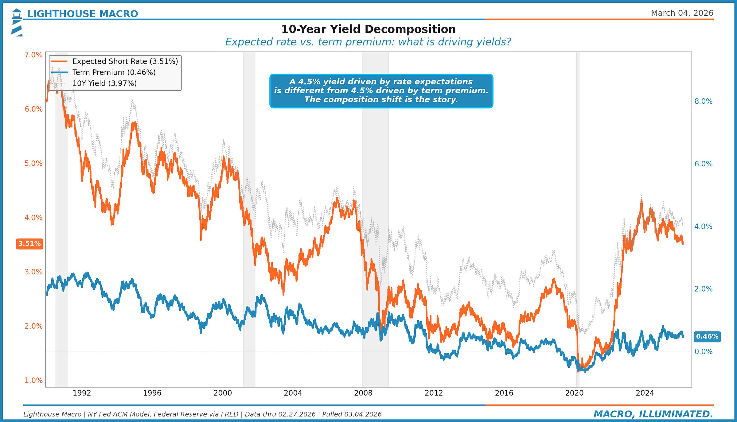 The 10-year yield tells you very little on its own. A 4.5% yield driven by expectations of higher short rates is very different from 4.5% driven by term premium. The former says the market expects the Fed to stay tight. The latter says the market demands compensation for fiscal risk. The investment implications are completely different.