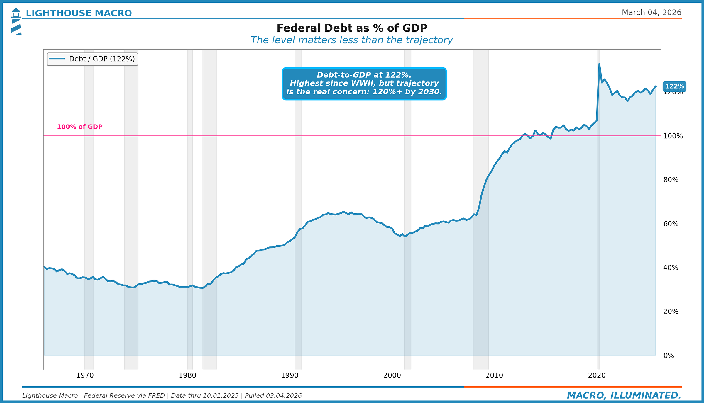 Gross federal debt stands at 122% of GDP. The level itself is manageable. Japan runs above 250% and functions (though with very different dynamics: domestic savings surplus, current account surplus, and a captive buyer base through the Bank of Japan). The issue for the U.S. is not the level. It is the trajectory, combined with the fact that the U.S. relies on external financing and the marginal buyer is increasingly price-sensitive.