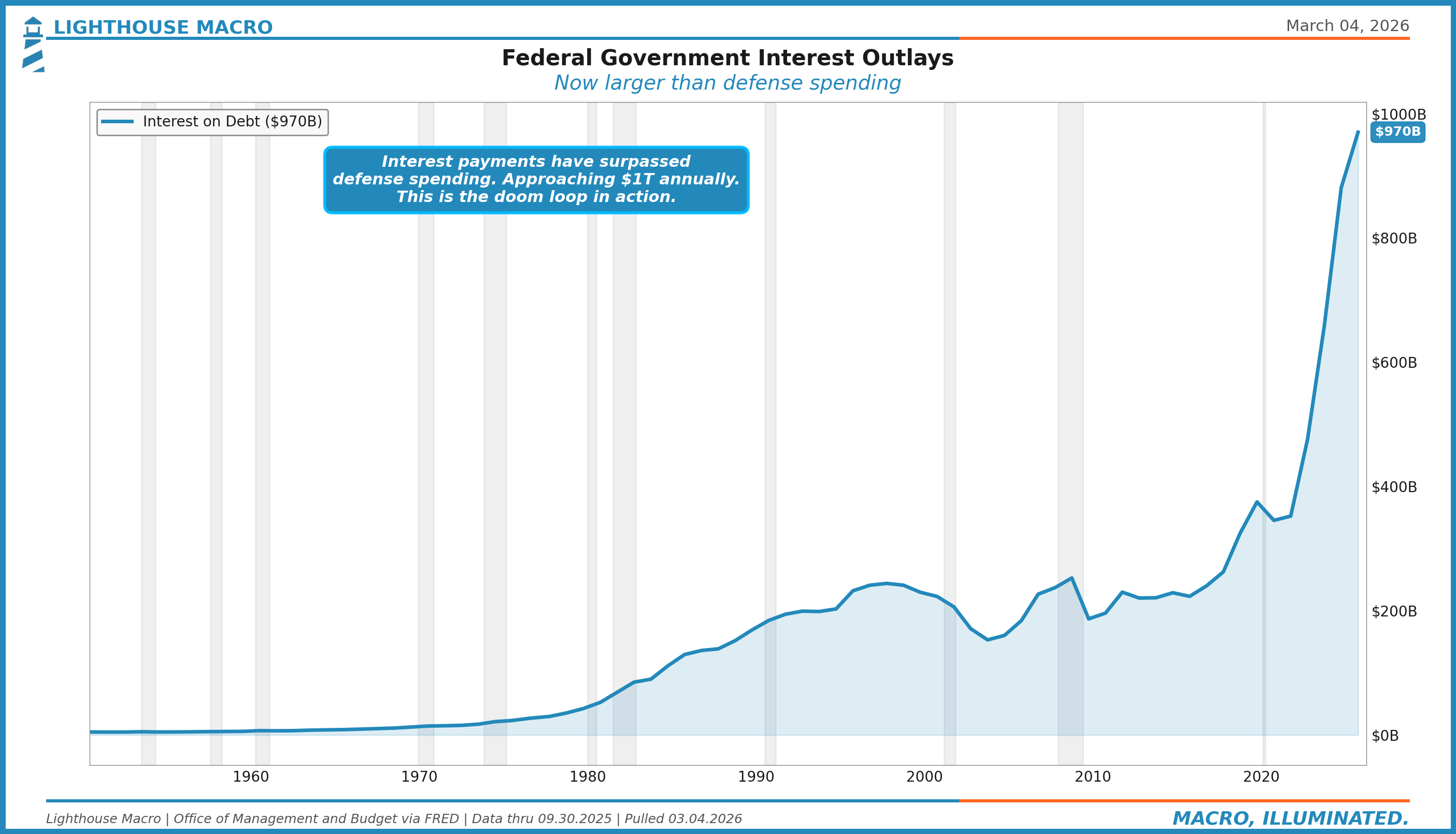 We think the single most under-discussed risk in markets today is not a recession. It is the government’s tab. And unlike a recession, this one does not self-correct. Deficits do not narrow when growth slows because mandatory spending (Social Security, Medicare, interest) accelerates on autopilot. The math runs in one direction.