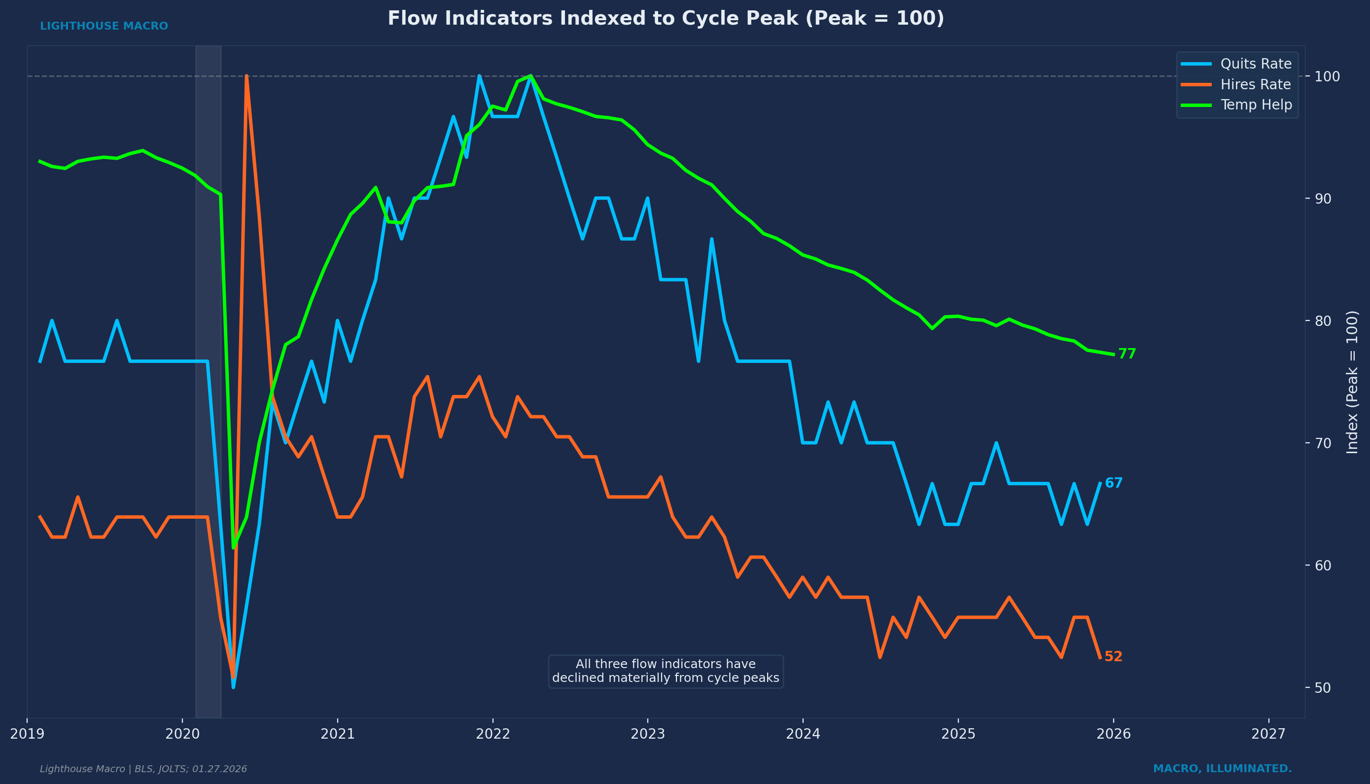 Leading indicators move first. They are the canaries. These capture decisions being made today that will show up in headline data months from now. When companies stop hiring temps, when workers stop quitting, when the hiring rate begins to slide even as unemployment stays low, these shifts register in real time. Their implications will not become obvious until the lagging data catches up.