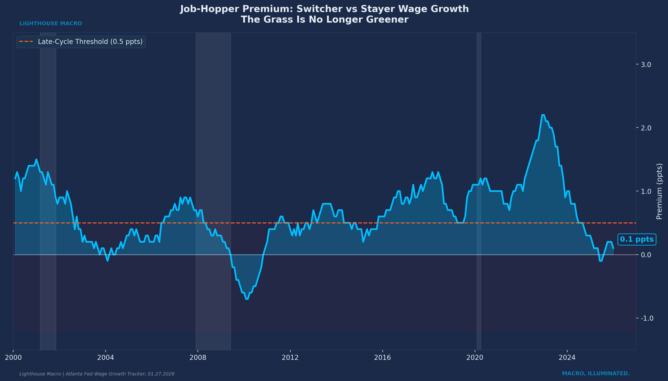 Historical pattern: The premium collapsed to near zero around every recession since the Atlanta Fed Wage Growth Tracker began. Current reading sits at 0.1-0.2 percentage points, down from over 2 percentage points in 2021-2022. The grass is no longer greener. Workers know something.