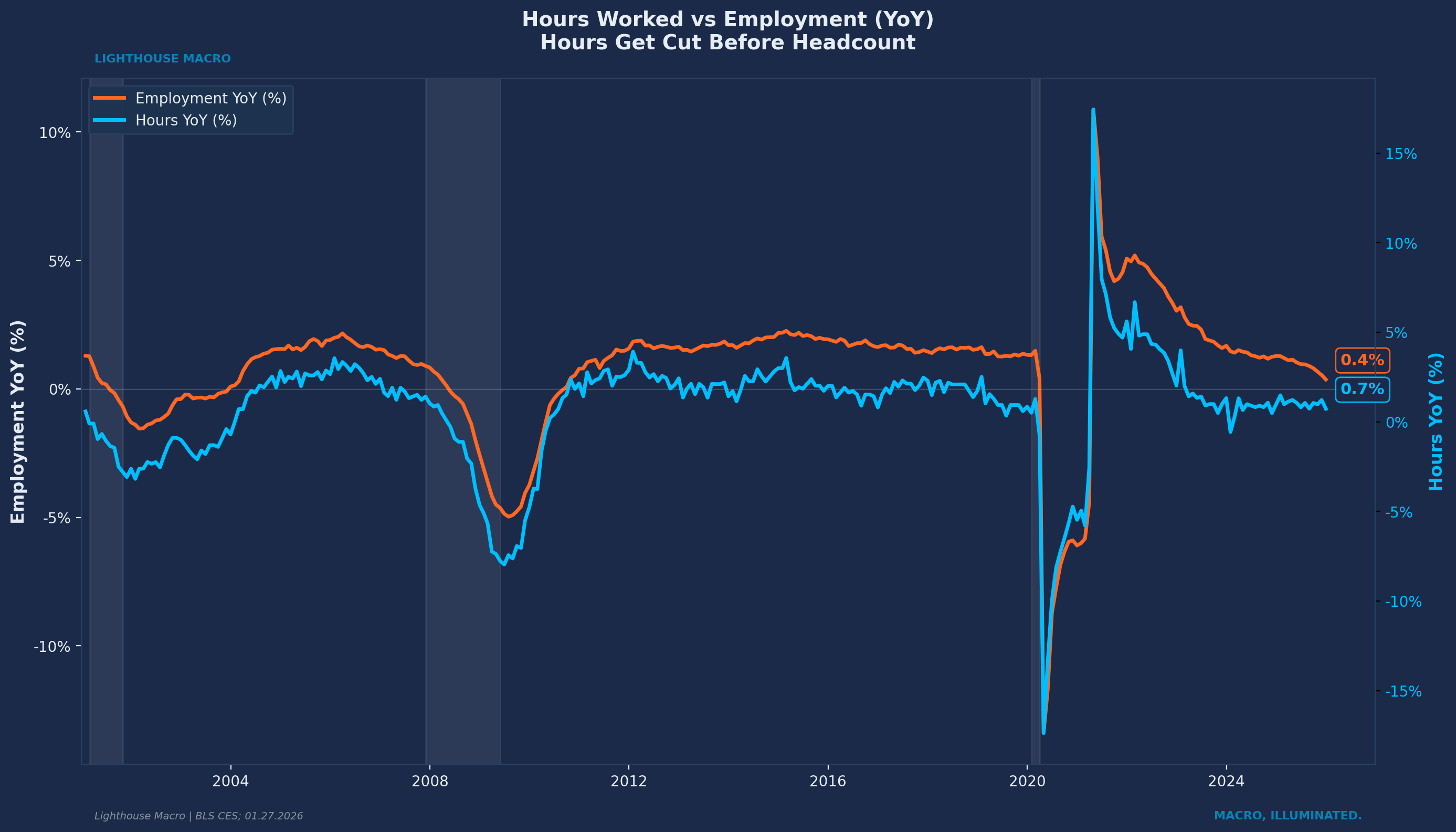 The chart shows aggregate hours (YoY) plotted against employment (YoY). Hours consistently turn down before employment at cycle inflection points. The logic is straightforward: cutting hours costs nothing. Cutting workers costs severance, institutional knowledge, and the risk that you cannot rehire when conditions improve. So hours absorb the initial shock. When hours decline while employment holds steady, that divergence is a warning. The economy is weakening at the intensive margin (fewer hours per worker) before it weakens at the extensive margin (fewer workers).