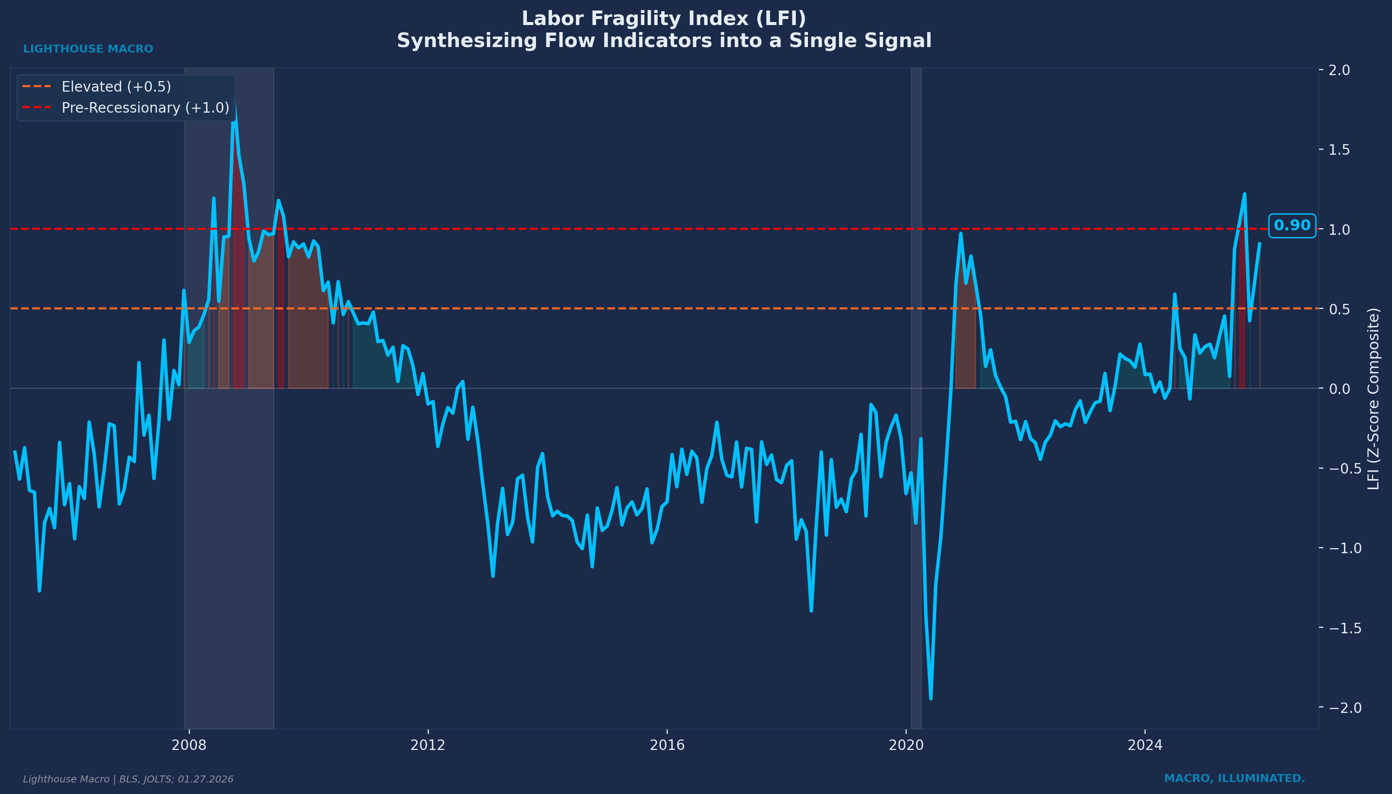 Where do our composites stand? The Labor Pulse Index (LPI) currently reads approximately -0.4, placing us in the “softening” regime where fragility is developing and cyclical exposure should be reduced. The Labor Fragility Index (LFI) sits near +0.9, elevated and approaching the pre-recessionary threshold of +1.0. These are not recession readings. But they are not expansion readings either. The labor market is in transition, and the direction is not encouraging.