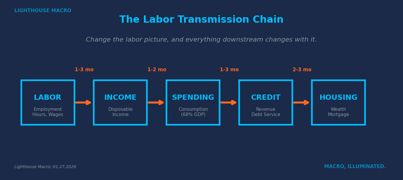When we talk about economic cycles, we are really talking about labor cycles dressed up in different clothes. The transmission chain runs in one direction: employment leads to income, income enables spending, spending generates revenue, revenue justifies credit, credit supports housing, and housing anchors household wealth. Change the labor picture, and everything downstream changes with it.