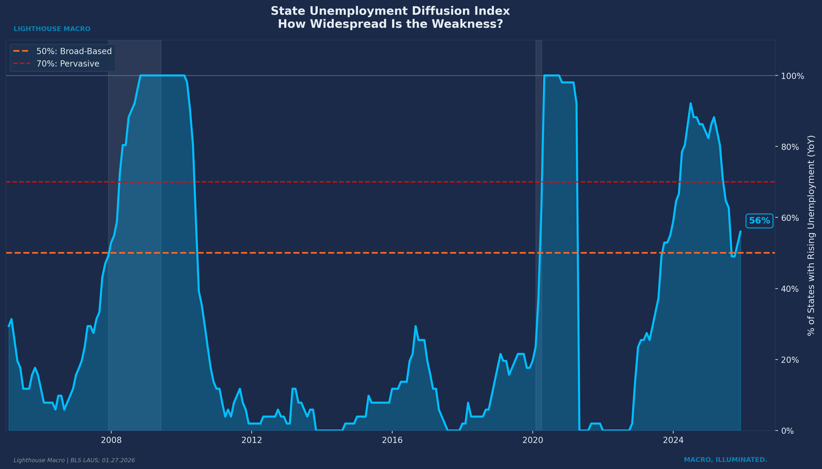 State Labor Market Diffusion. Percentage of states with rising unemployment over a three-month window. Sustained readings above 50% signal systemic stress, not idiosyncratic weakness.