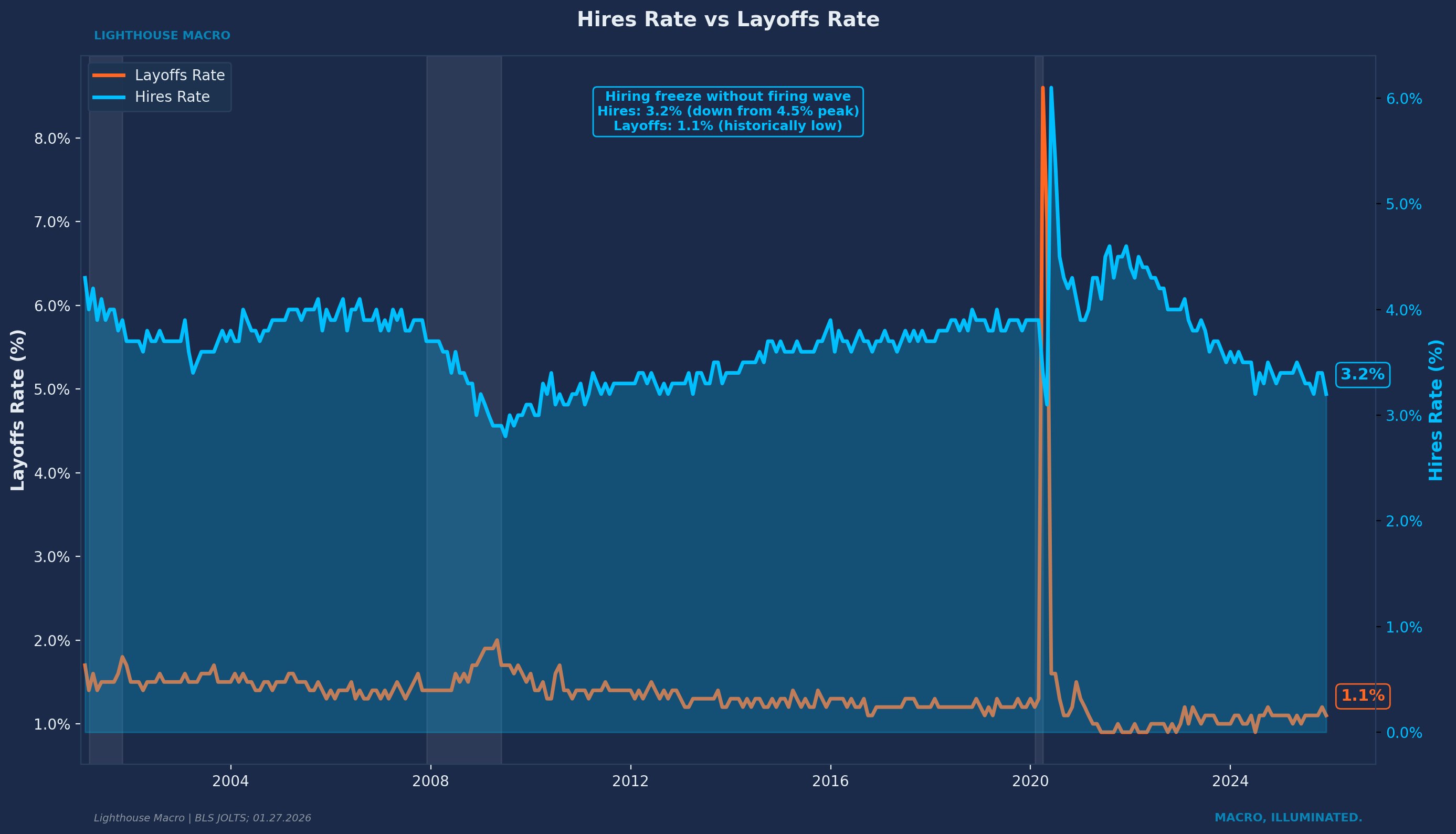 The Hiring Rate shows new hiring as a percentage of employment. When paired with the layoffs rate, it reveals the “hiring freeze without firing wave” phenomenon that characterizes late-cycle labor markets.