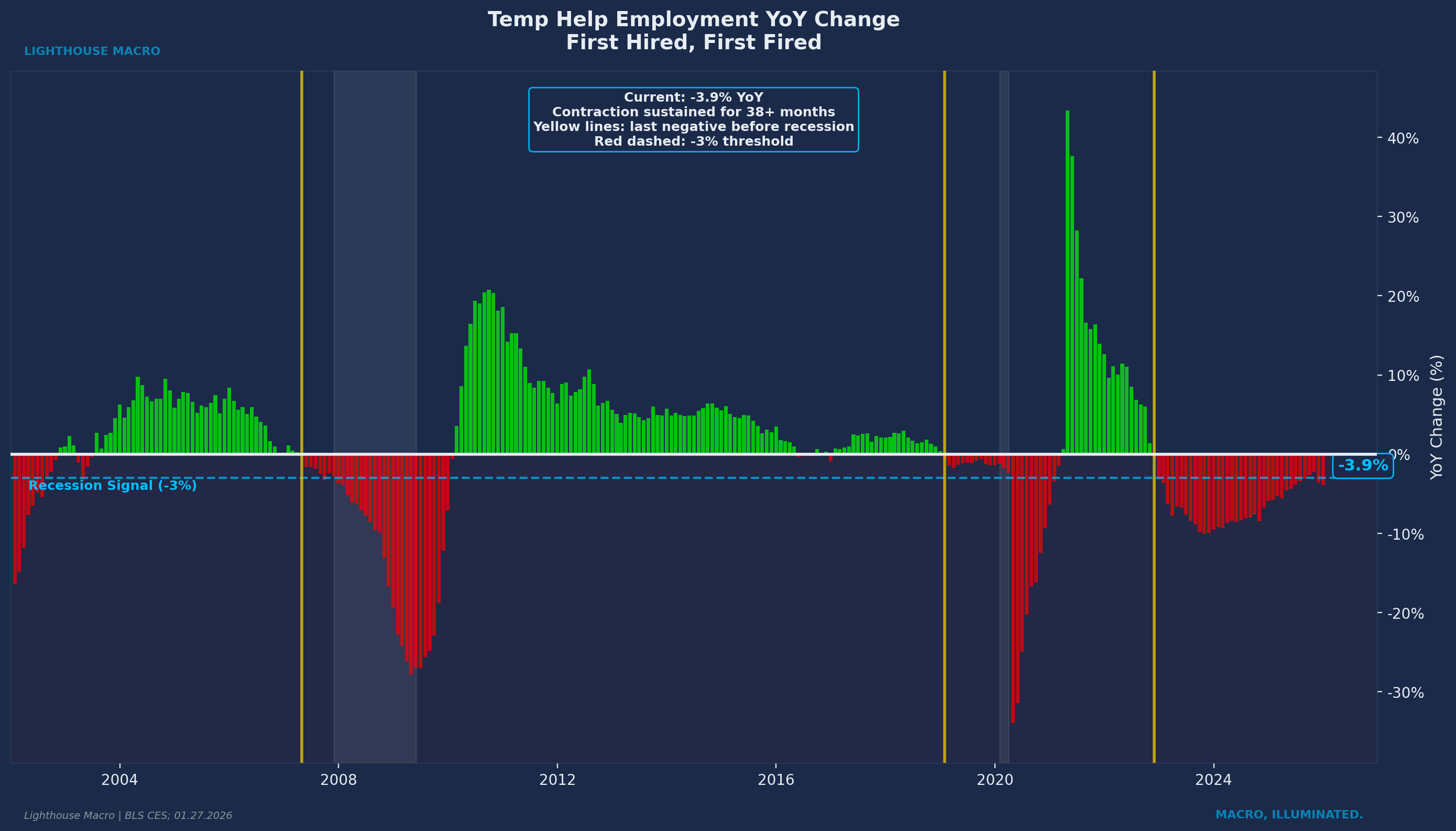 Historical validation: Temp help employment YoY has gone negative before all three post-2000 recessions with lead times ranging from 1 to 12 months. Current reading shows YoY contraction of approximately 3-4%, persisting for over two years.