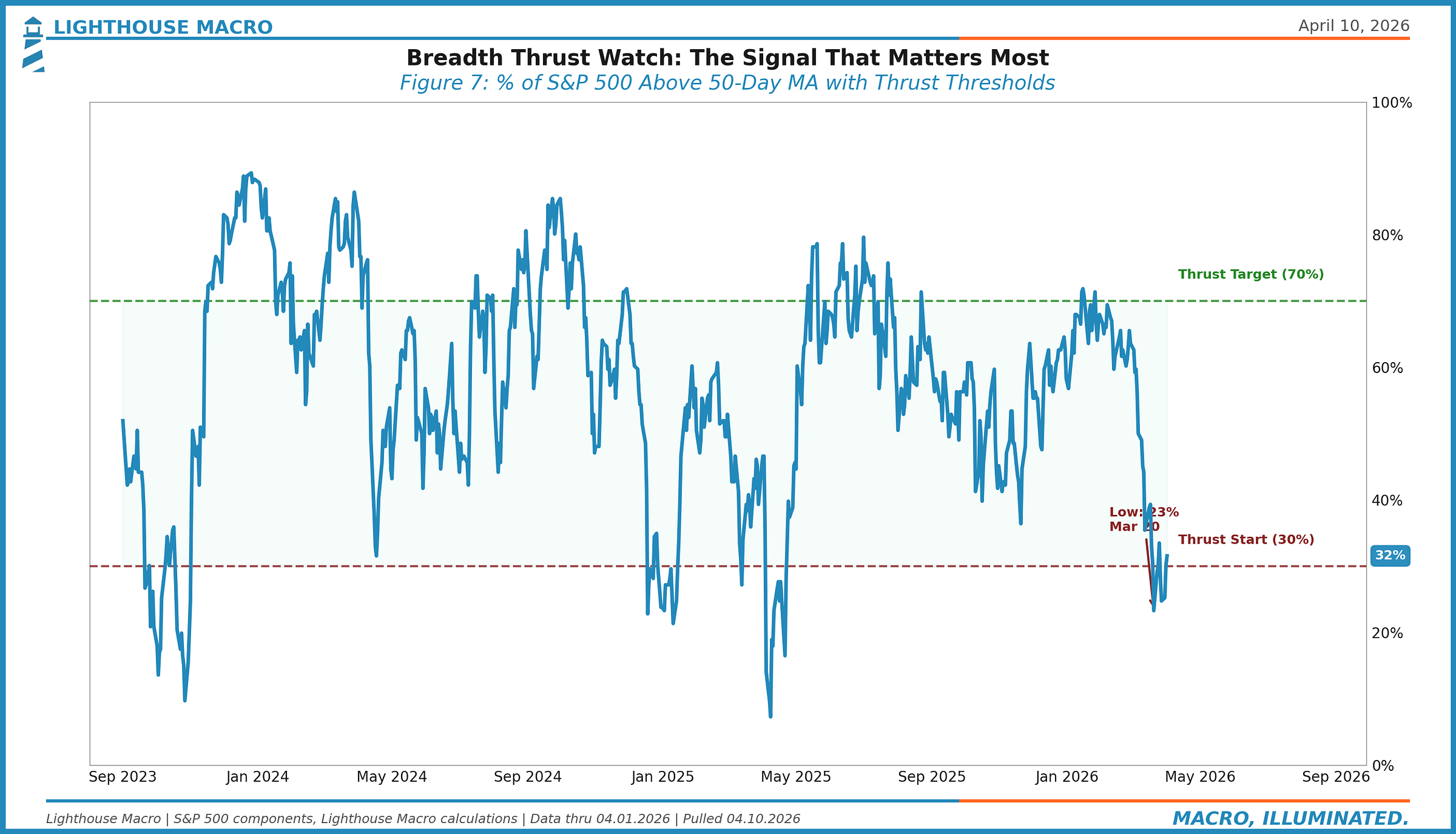 % above 50-day MA triggers a breadth thrust (30% → 70% in 10 days)