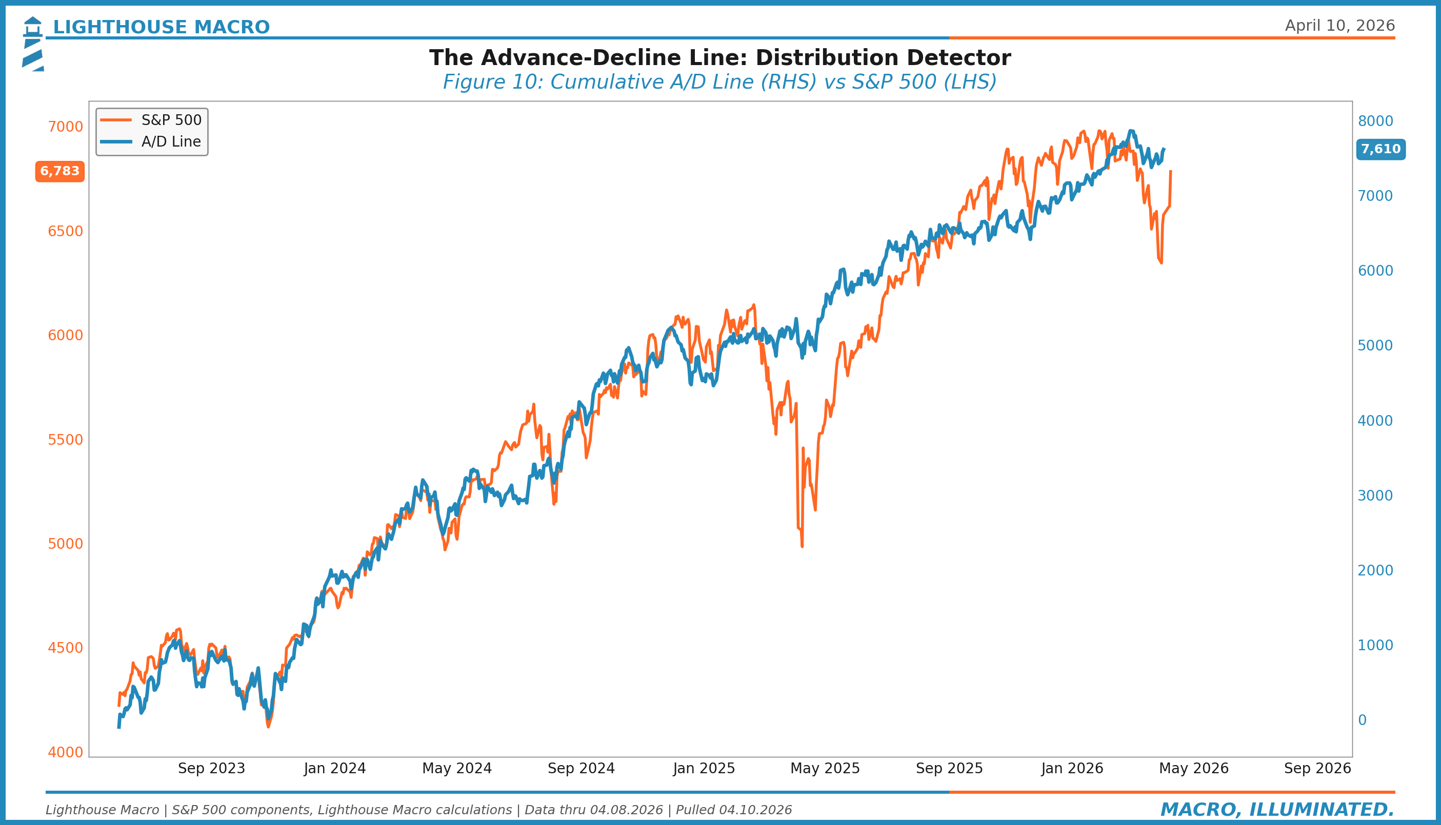 The signal comes from divergences. If the S&P 500 is making new highs but the A/D line isn’t, distribution is happening beneath the surface. Someone is selling into strength. This divergence preceded the 2000 top, the 2007 top, and the 2022 top.