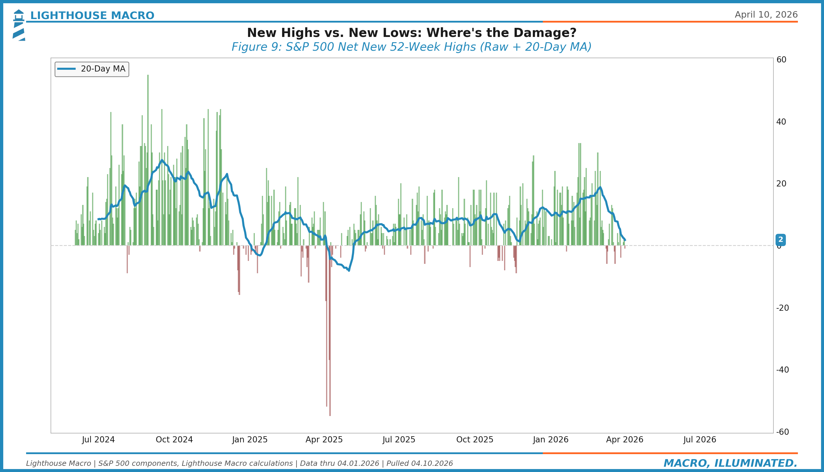 New Highs minus New Lows, 20-day MA: The rate of new extremes. When new lows dominate, the damage is broad. When new highs dominate, the advance is healthy.