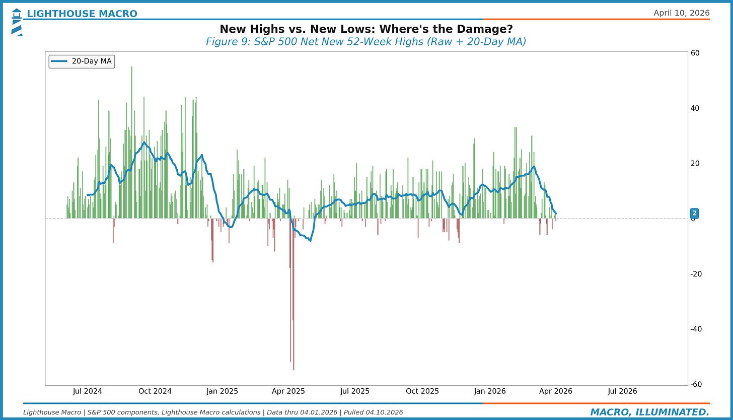 This metric fell sharply in March as the oil shock and tariff uncertainty hit mid-caps and small-caps harder than mega-caps. The divergence between the index (which held up relatively well on mega-cap resilience) and the median stock (which didn’t) was a textbook narrowing signal.