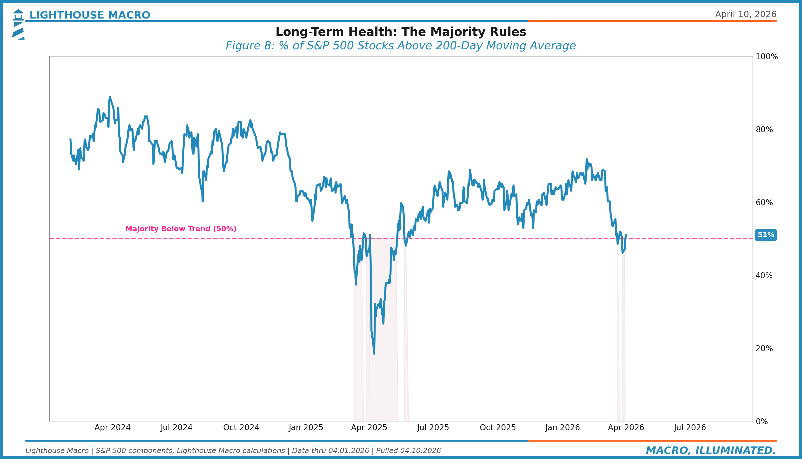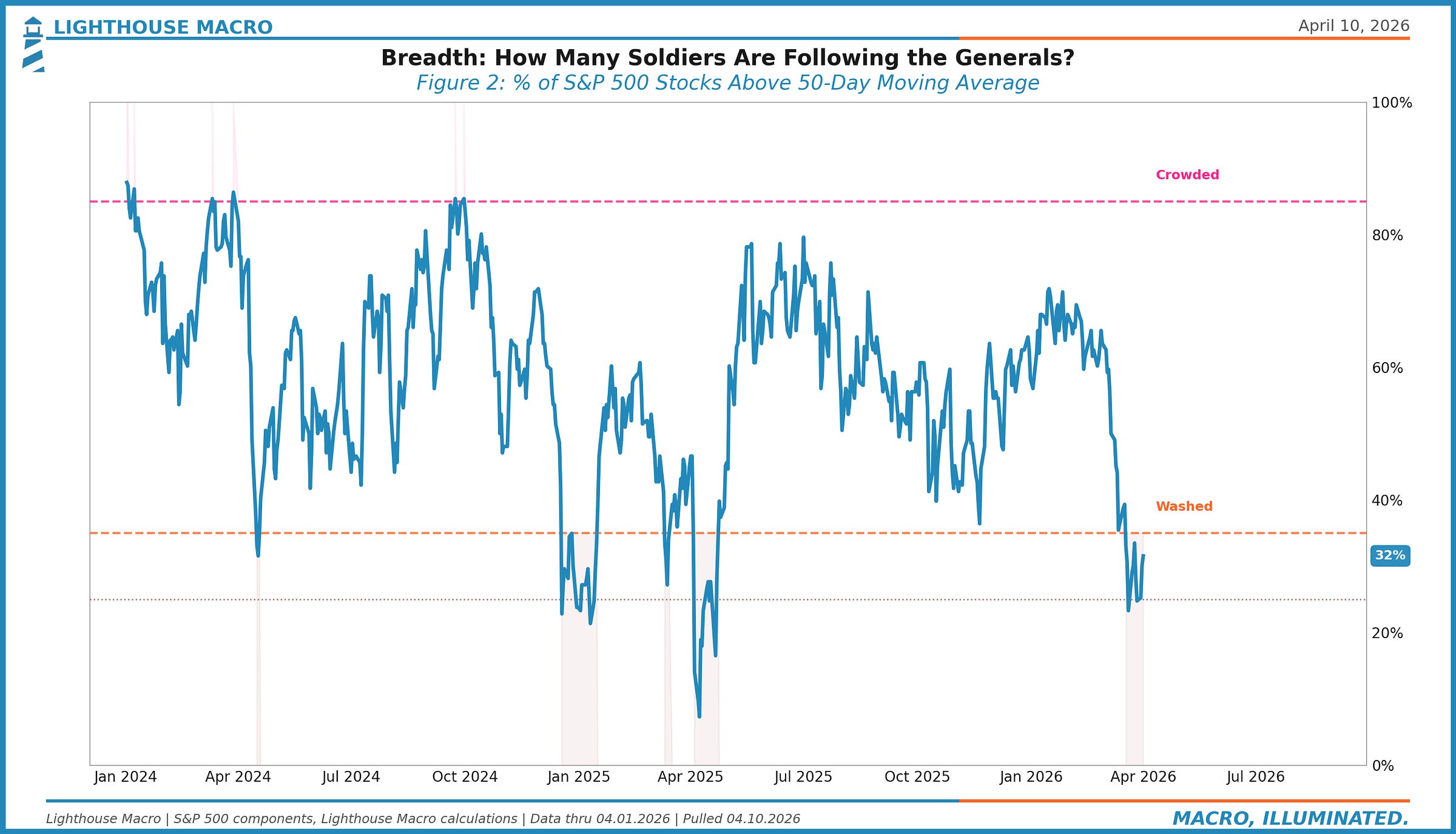 This is the participation metric we watch most closely. It answers: what percentage of S&P 500 stocks are above their own 50-day moving averages?