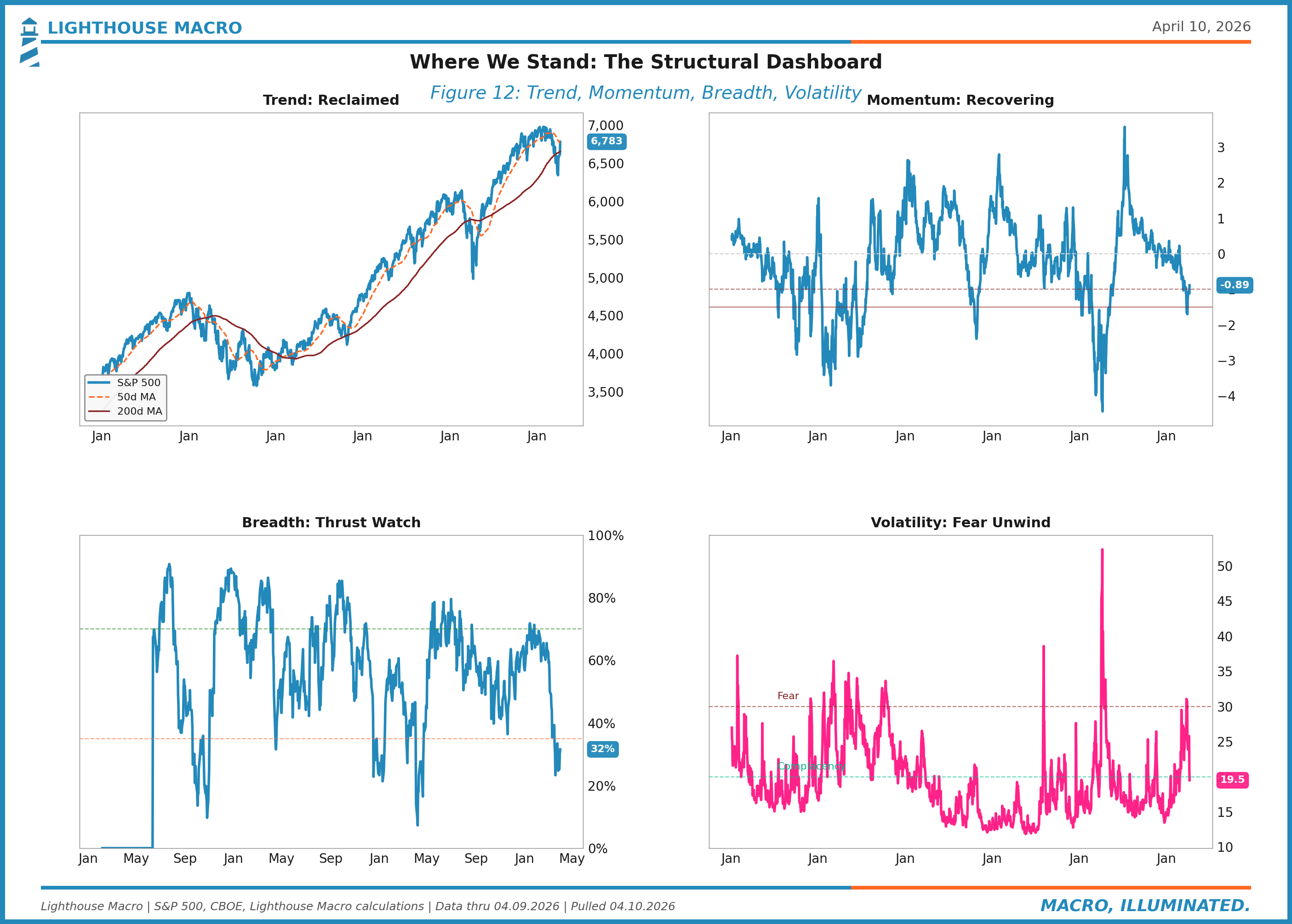 The honest read: the structural picture has improved more in two sessions than it did in the preceding three weeks. That’s meaningful. But the improvement came from a single exogenous catalyst (the ceasefire) whose durability is actively being questioned. Iran says it’s been violated. Israel says Lebanon isn’t included. Oil is back at $98. The framework says: watch whether the reclaim holds, watch whether breadth thrusts, and don’t confuse a relief rally with a regime shift until the data confirms it.