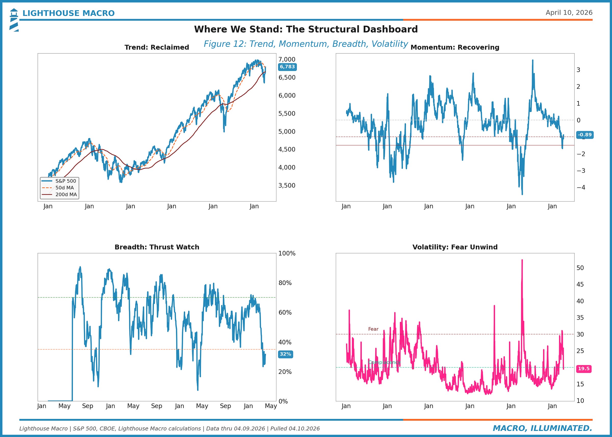 Breadth: Improved from washed, thrust watch active. % above 50-day MA has risen from the low 30s. We’re watching for the breadth thrust trigger: 30% to 70% in 10 sessions. If it fires, that’s one of the most reliable buy signals in equity markets. It hasn’t fired yet.