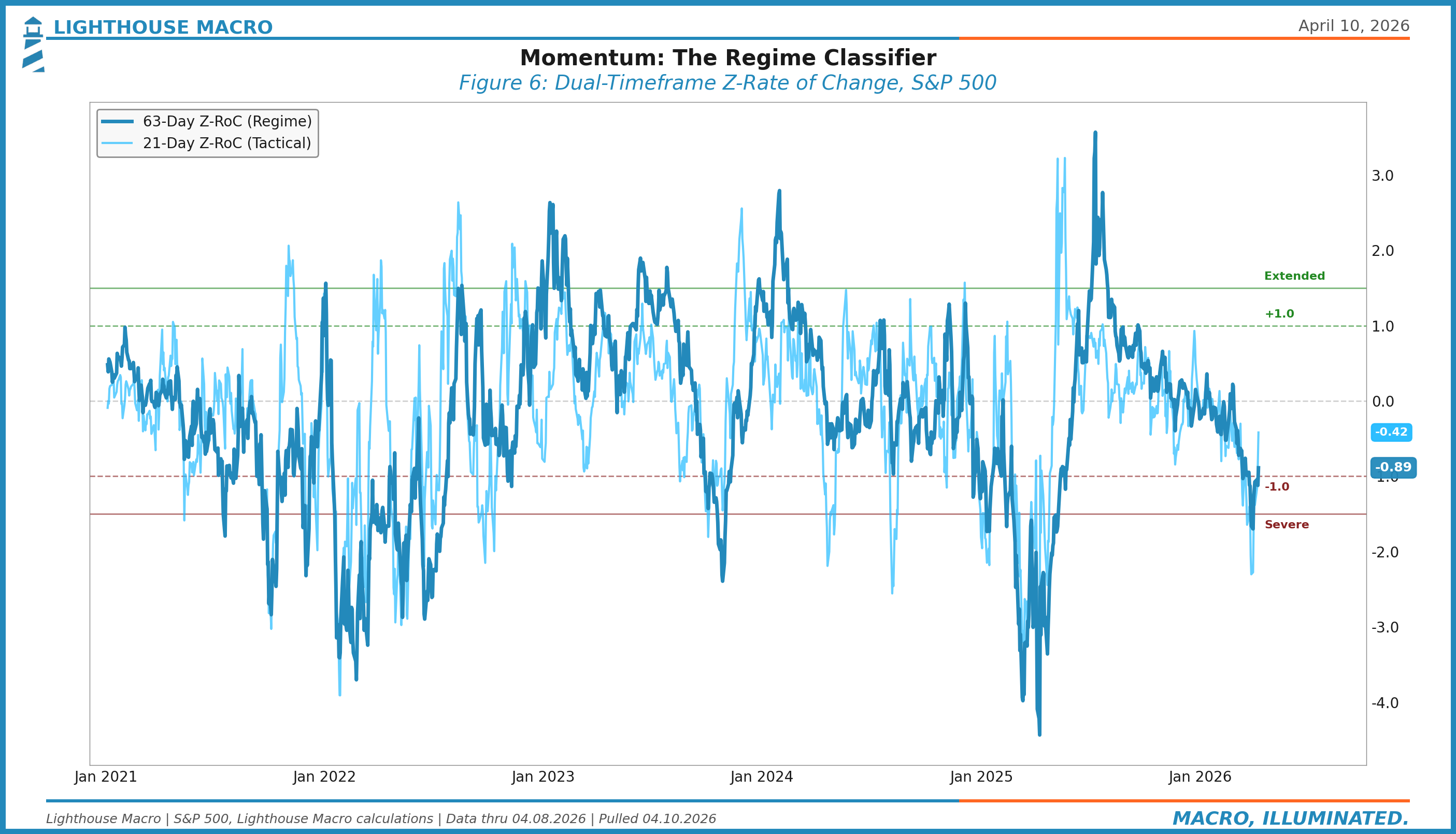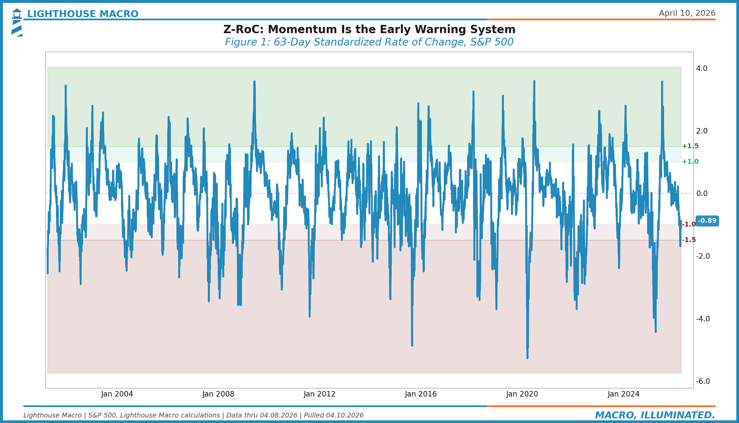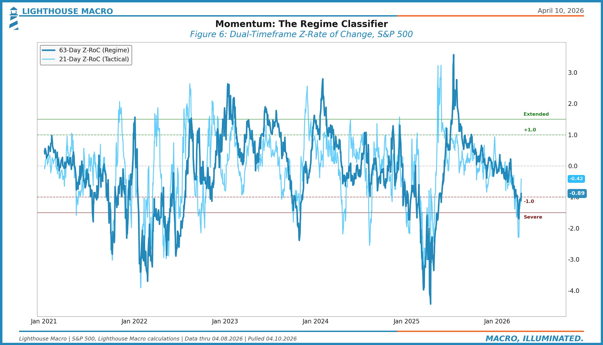 Z-RoC, 63-day: The core momentum measure. This is the 3-month standardized rate of change. Below -1.0, momentum is broken. Above +1.0, it’s strong. At extremes beyond +/-1.5, mean reversion risk rises.