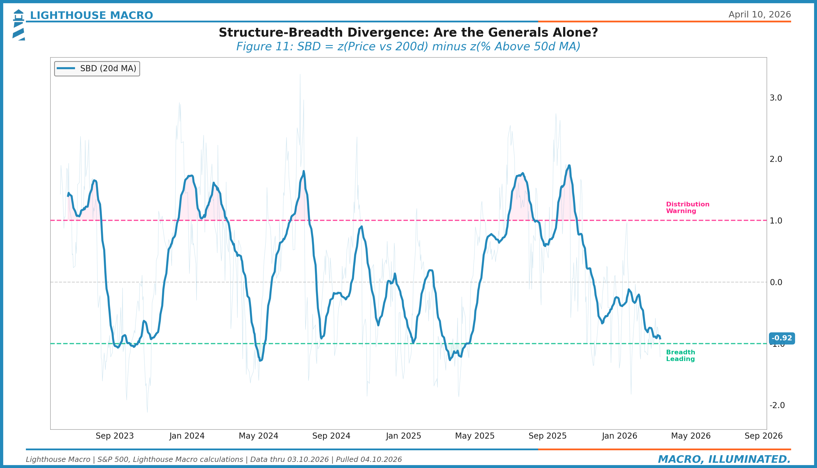 When SBD is below -1.0, the opposite is true: breadth is stronger than the index, which typically means the index is about to catch up in a rally.