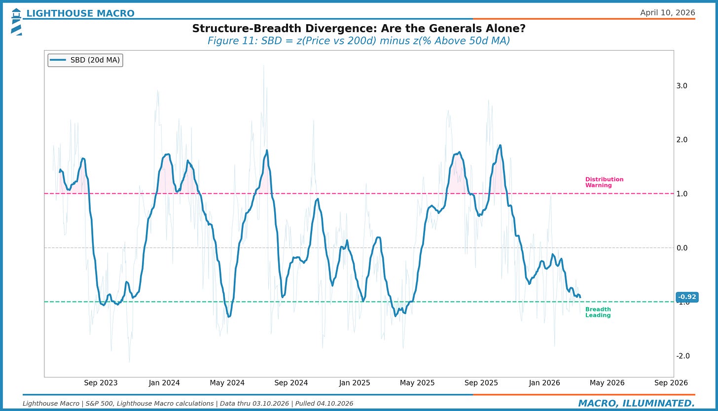 SBD = z(Price vs 200d) - z(% Stocks > 50d MA)When SBD exceeds +1.0, the index is outperforming the median stock by more than a standard deviation. That’s the “generals without soldiers” setup. Historically, SBD > +1.0 precedes meaningful pullbacks within 4-8 weeks about 70% of the time.