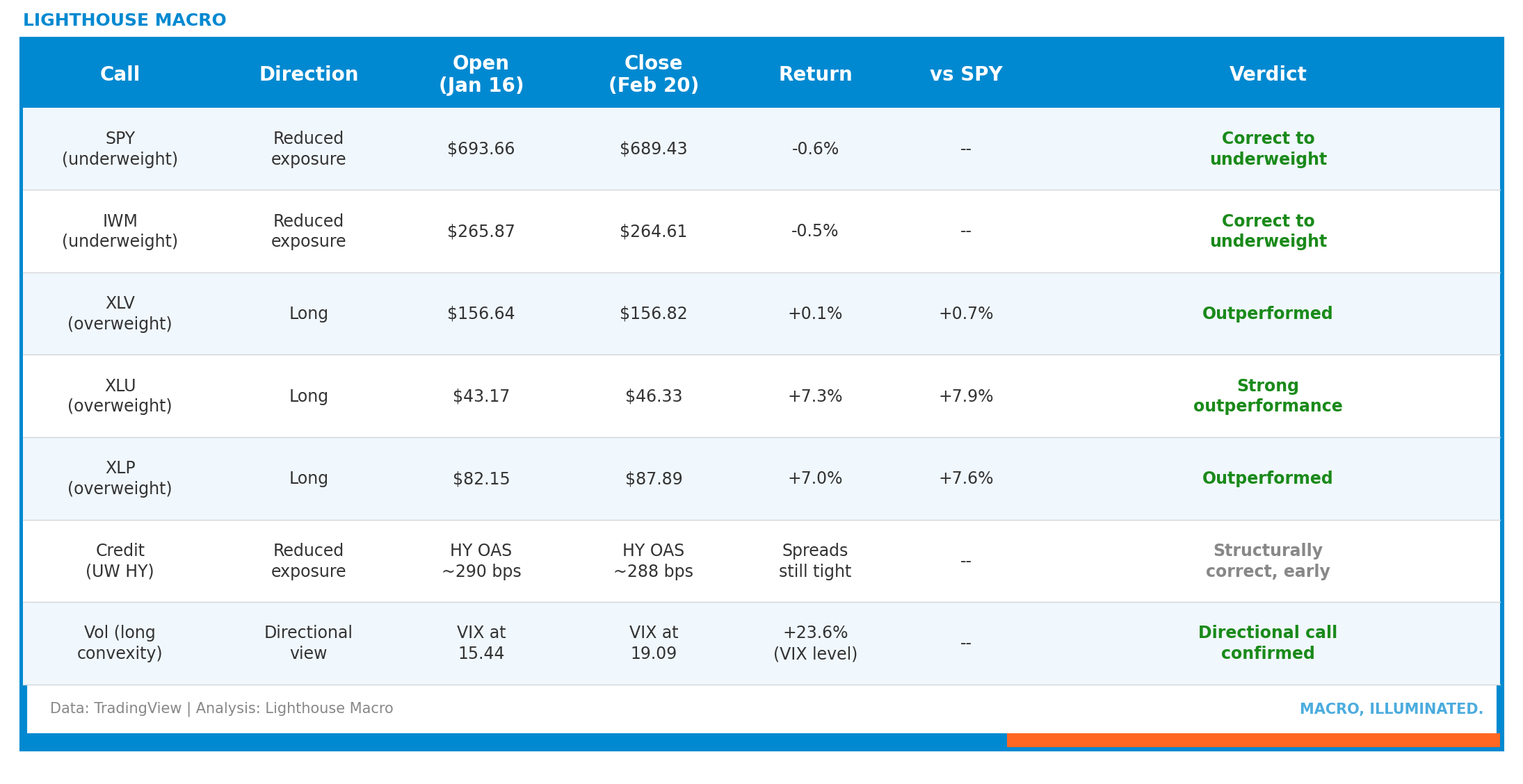 Four of six legs clearly working (SPY underweight, XLP, XLU, vol). IWM and XLV essentially flat. Credit underweight structurally intact but early. The SCOTUS relief rally does not break any of these calls.