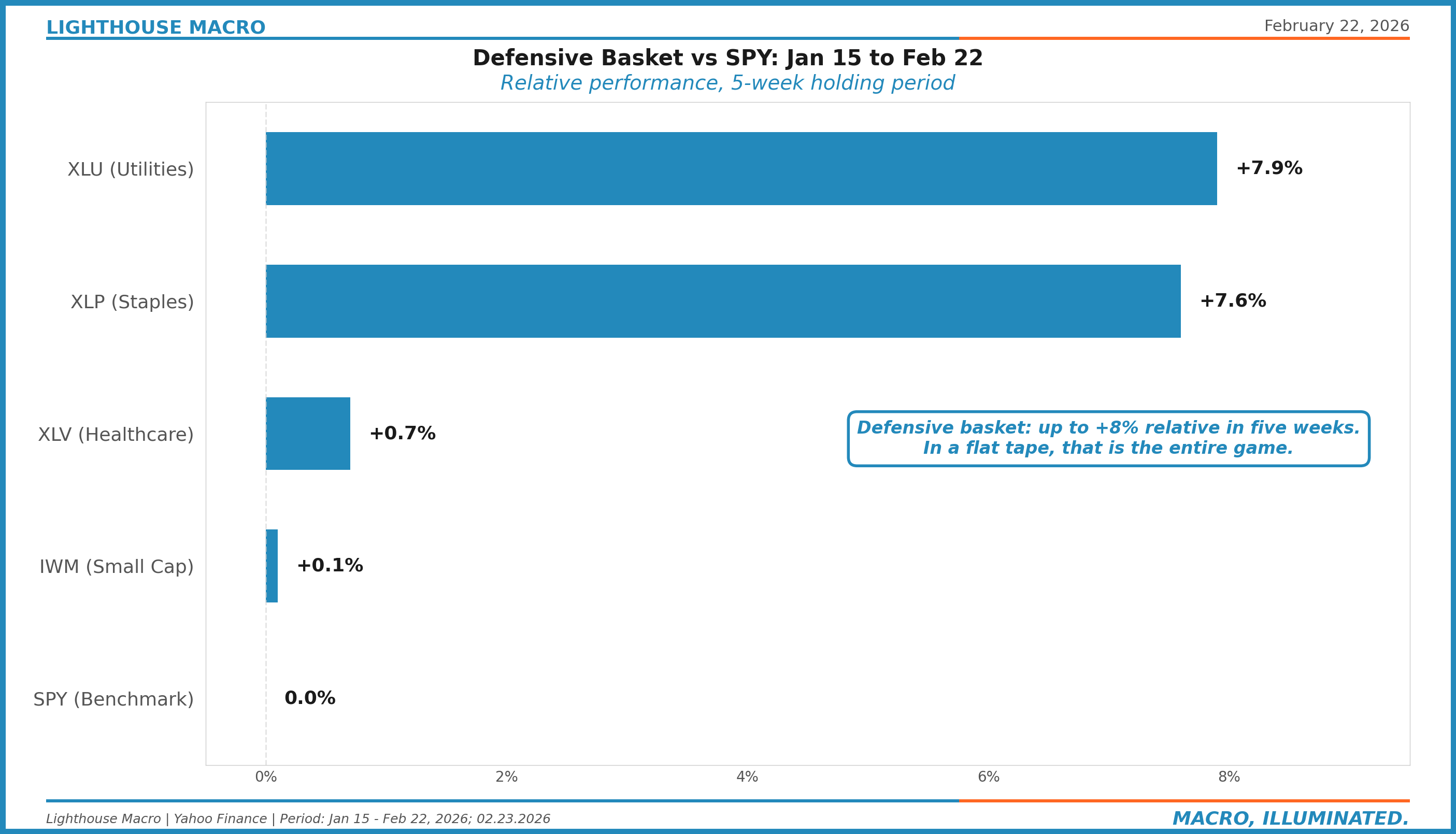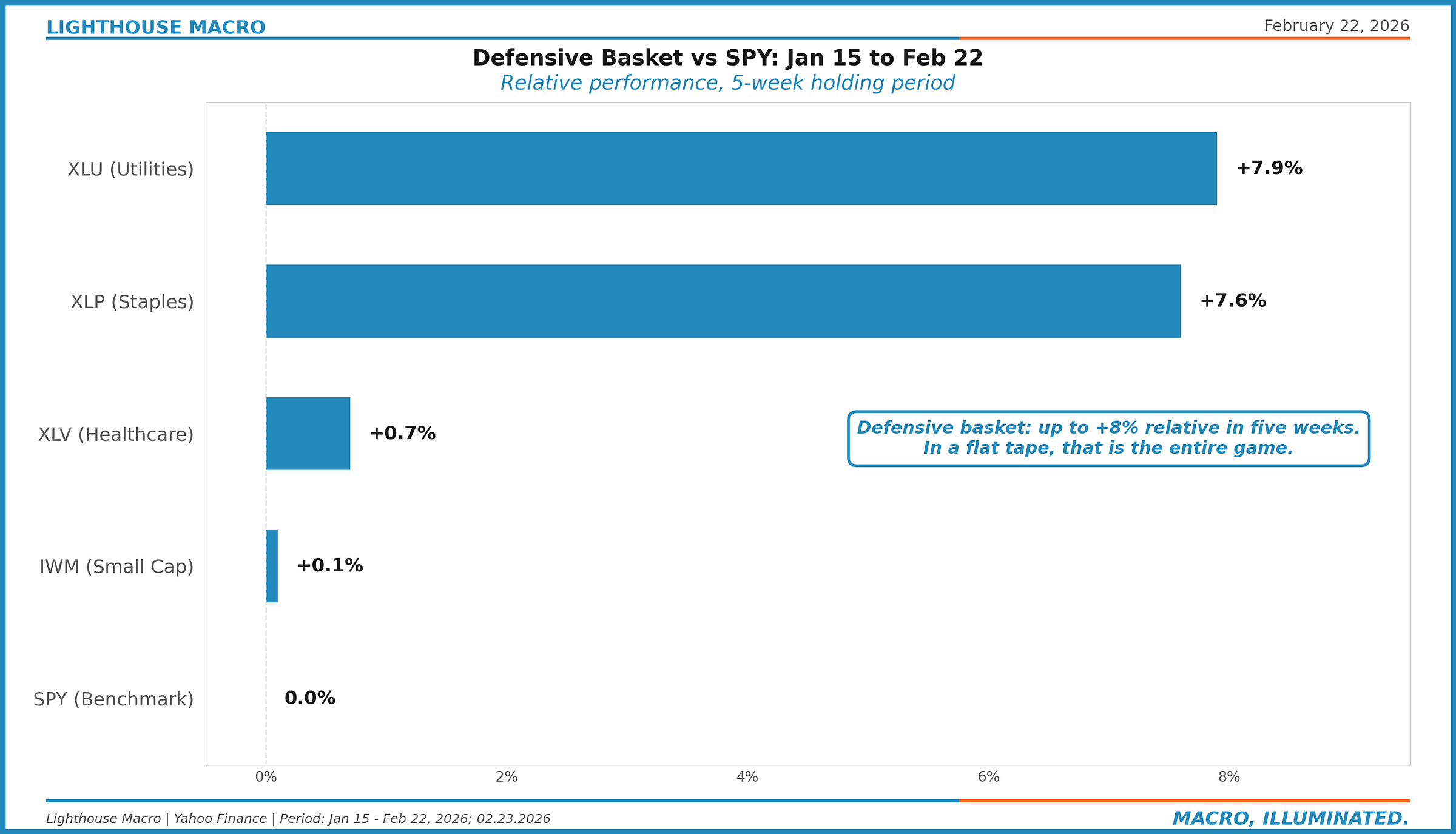 Defensive basket vs. SPY: XLU +7.9% and XLP +7.6% relative in five weeks. IWM and XLV flat. The calls that worked, worked big.