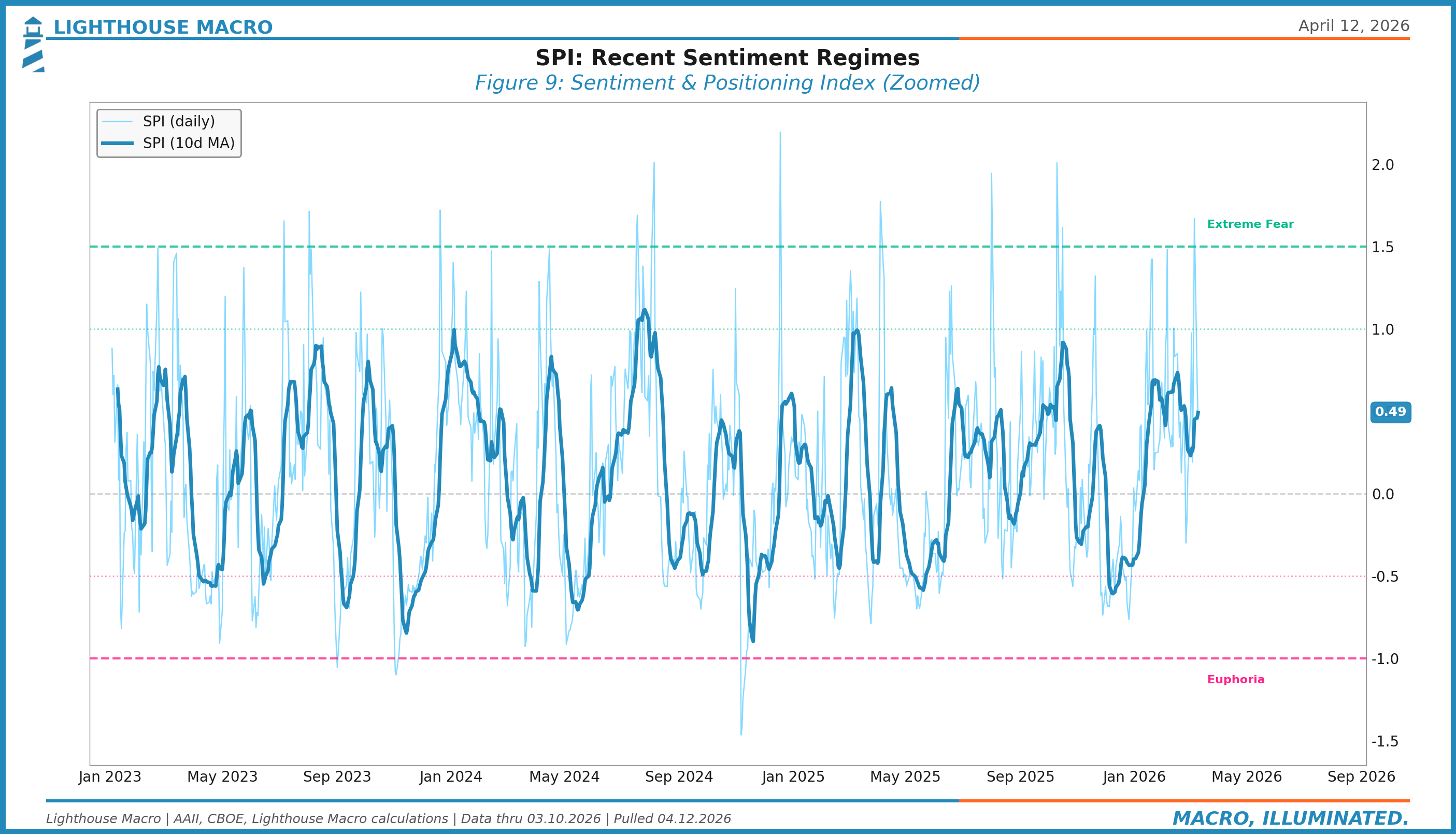 The zoomed view shows the SPI’s behavior during a period that included the 2023 banking stress, the late 2023 rally, the 2024 AI euphoria, and the 2025-2026 tariff volatility. Several observations stand out: