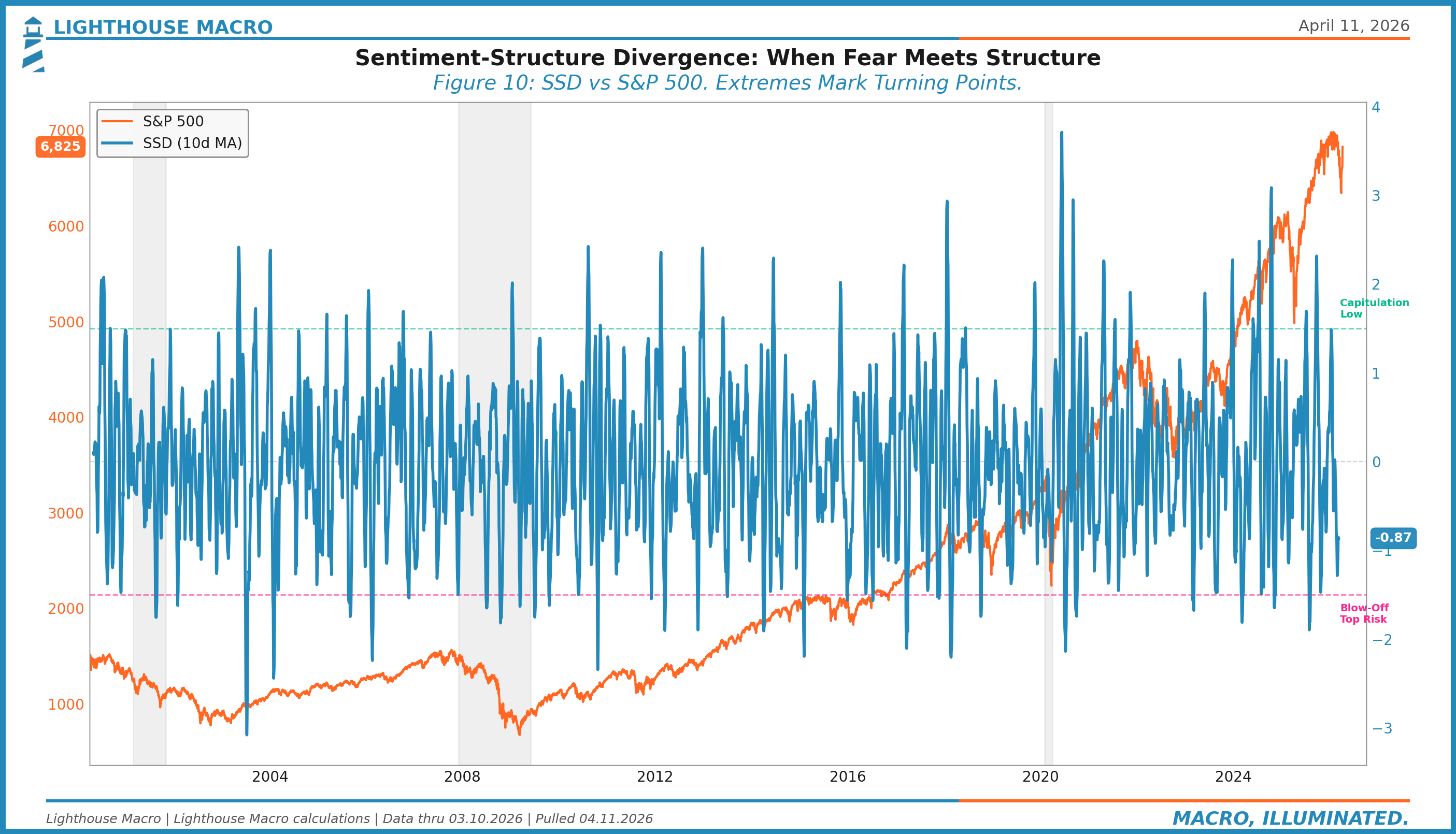 SSD > +1.5 (Capitulation Low): The crowd has capitulated (high SPI = fear) while market structure is simultaneously weak. Fear plus broken structure. This is the classic bottom formation. March 2020 and October 2022 were textbook SSD capitulation events.