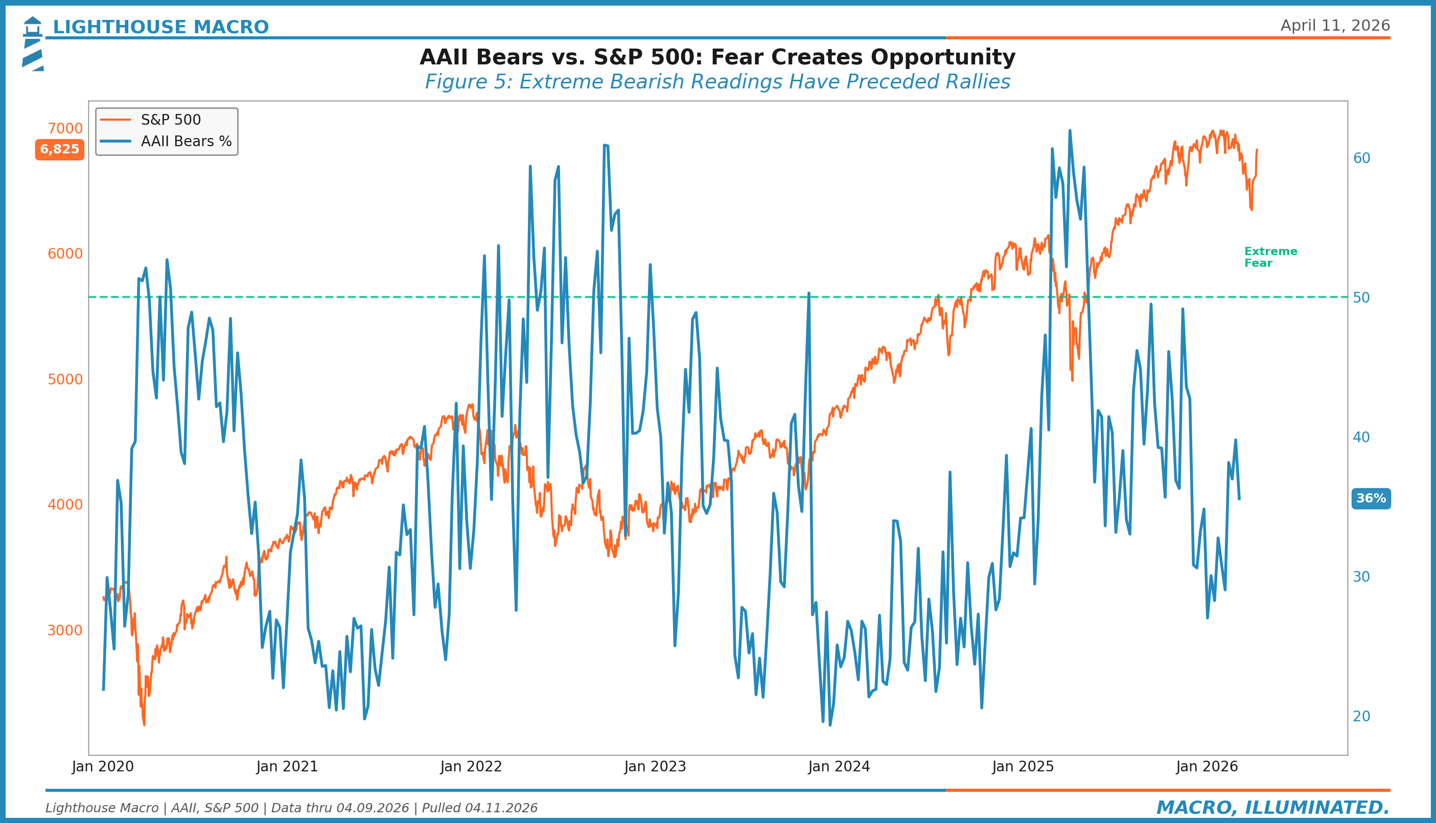 The best test of a sentiment framework is whether it correctly identifies when fear creates opportunity. Overlay the AAII bearish percentage against the S&P 500, and the pattern is stark: spikes in bearish sentiment align with equity troughs.