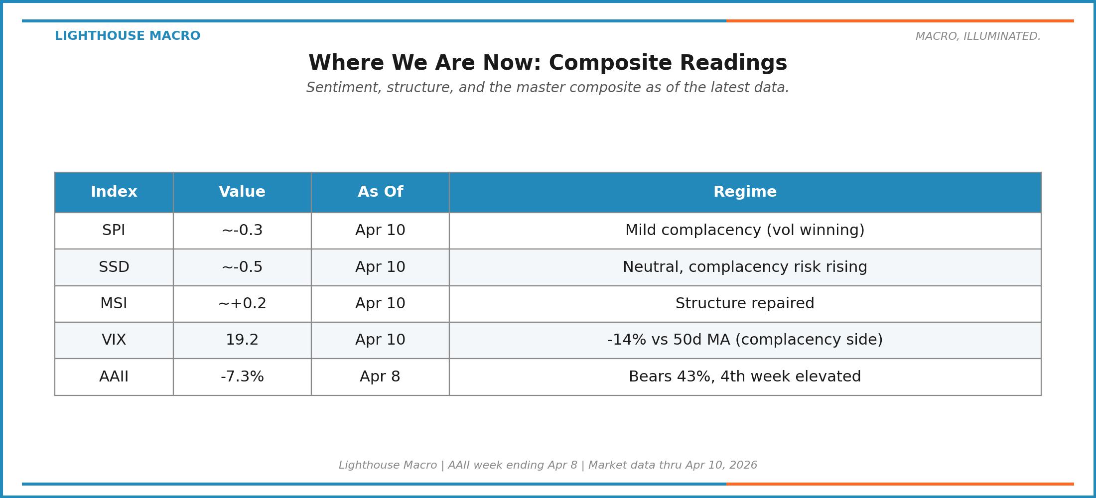 The honest read: The regime flipped. A month ago sentiment was neutral and structure was broken; today structure is healed and sentiment is tilting complacent while retail remains stuck-bearish. The contrarian edge has shifted, not to “buy the fear” (the fear is gone), but to “watch the retail-vol divergence.” When retail bearishness has persisted this long while implied vol compresses, the tape usually resolves by either (a) AAII bears capitulating upward as the rally pulls them in, or (b) a vol spike that vindicates the pessimists. The fast indicators are betting on (a). We’d agree, with the caveat that -20% VIX deviation is the line where complacency becomes its own warning signal.