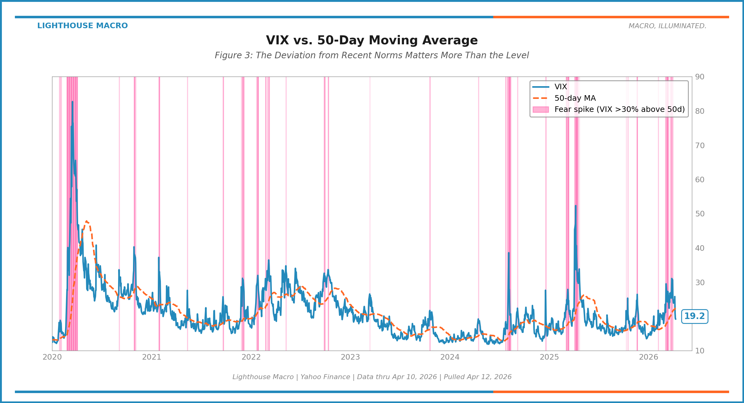 Above +30%: fear spike. The VIX has lurched above its recent average by a standard-deviation-plus move. These events typically resolve within 1-2 weeks, either by VIX declining (fear abating) or the 50-day MA rising to meet it (elevated fear becoming the new normal).