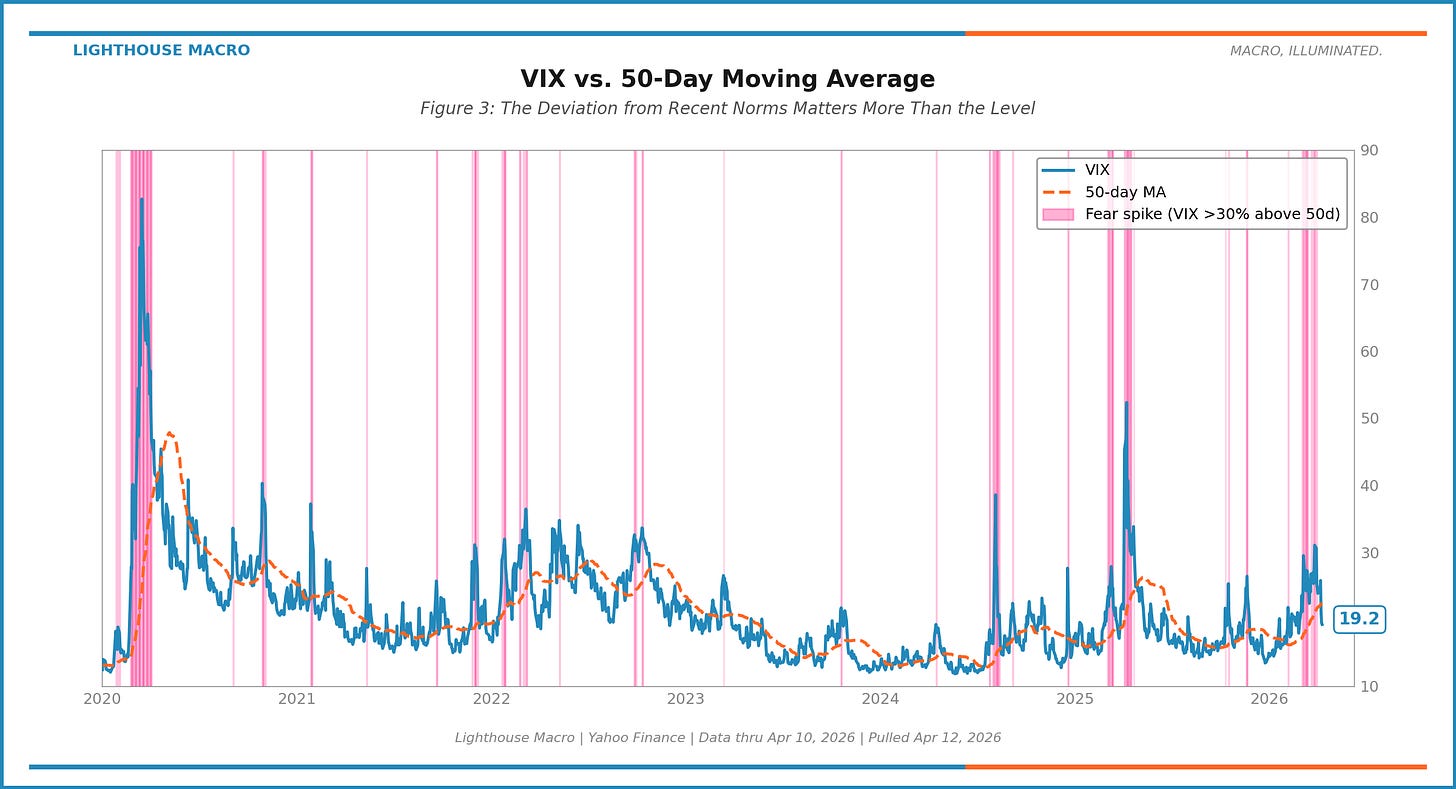 VIX vs. 50-day MA: Fear relative to recent context. The VIX level alone is misleading. A VIX at 25 that just spiked from 14 is an acute fear event. A VIX at 25 that’s been grinding there for months is background noise. The deviation from the 50-day captures the shock.