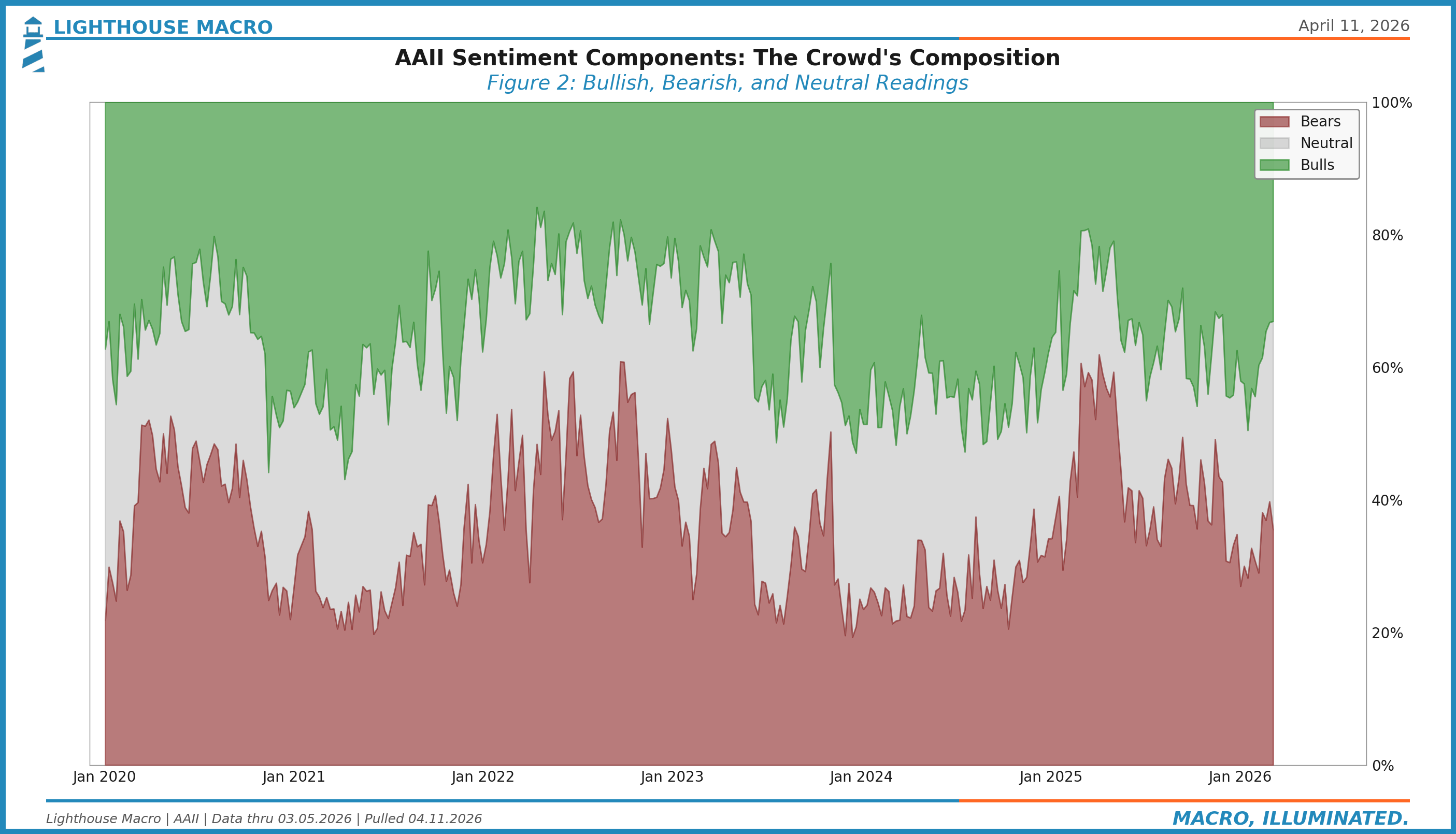The stacked area chart makes the regime shifts visible. Notice how bear-dominant readings in late 2022 and mid-2023 preceded rallies, while bull-dominant readings in early 2024 preceded corrections. The pattern isn’t mechanical (sentiment doesn’t predict with timing precision), but the directional bias at extremes is statistically robust.
