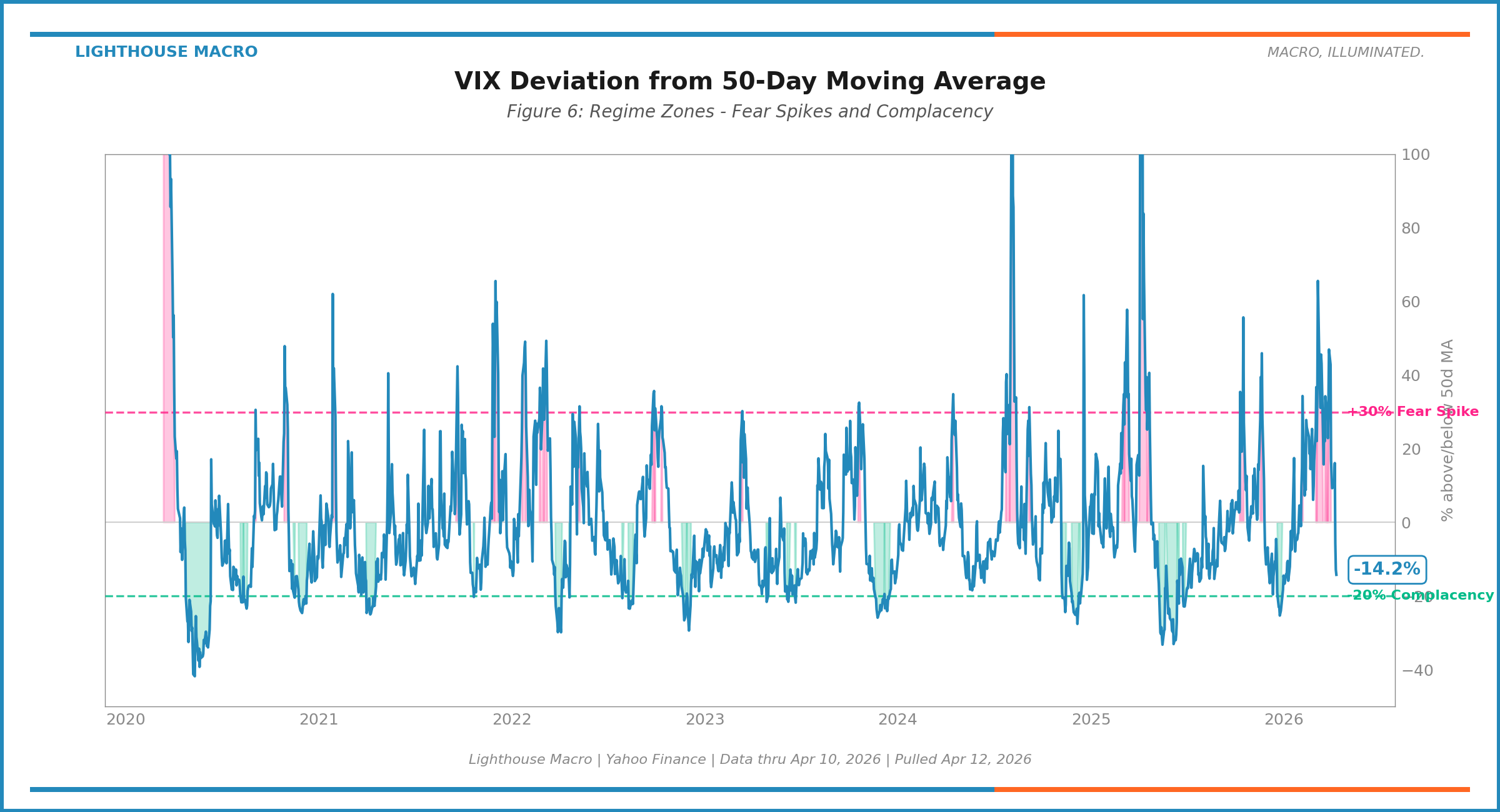 While AAII is weekly, the VIX deviation provides a daily sentiment read. This is the same concept as Figure 3 but focused on regime classification rather than the raw VIX level.