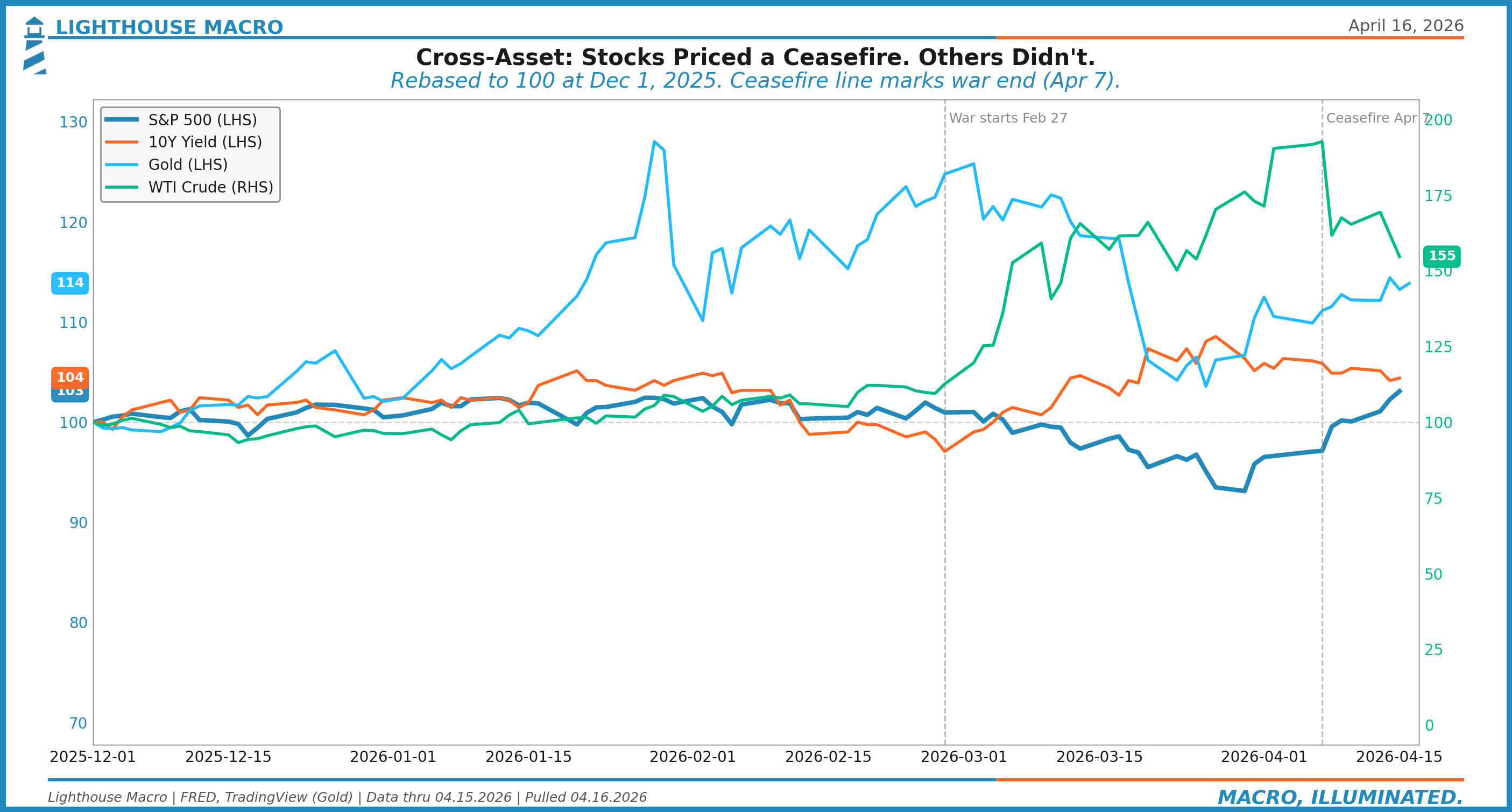 The ceasefire was announced April 7. Two weeks. In principle. Iran has already re-closed the Strait of Hormuz once, after Israeli strikes on Lebanon. WTI sits near $92, well off the $119 war peak but still forty percent above the pre-war $67. Gold is holding near $4,800. The ten-year is 4.27%, roughly where it was before the ceasefire. Stocks have fully priced a clean exit. Bonds, gold, and oil have not.
