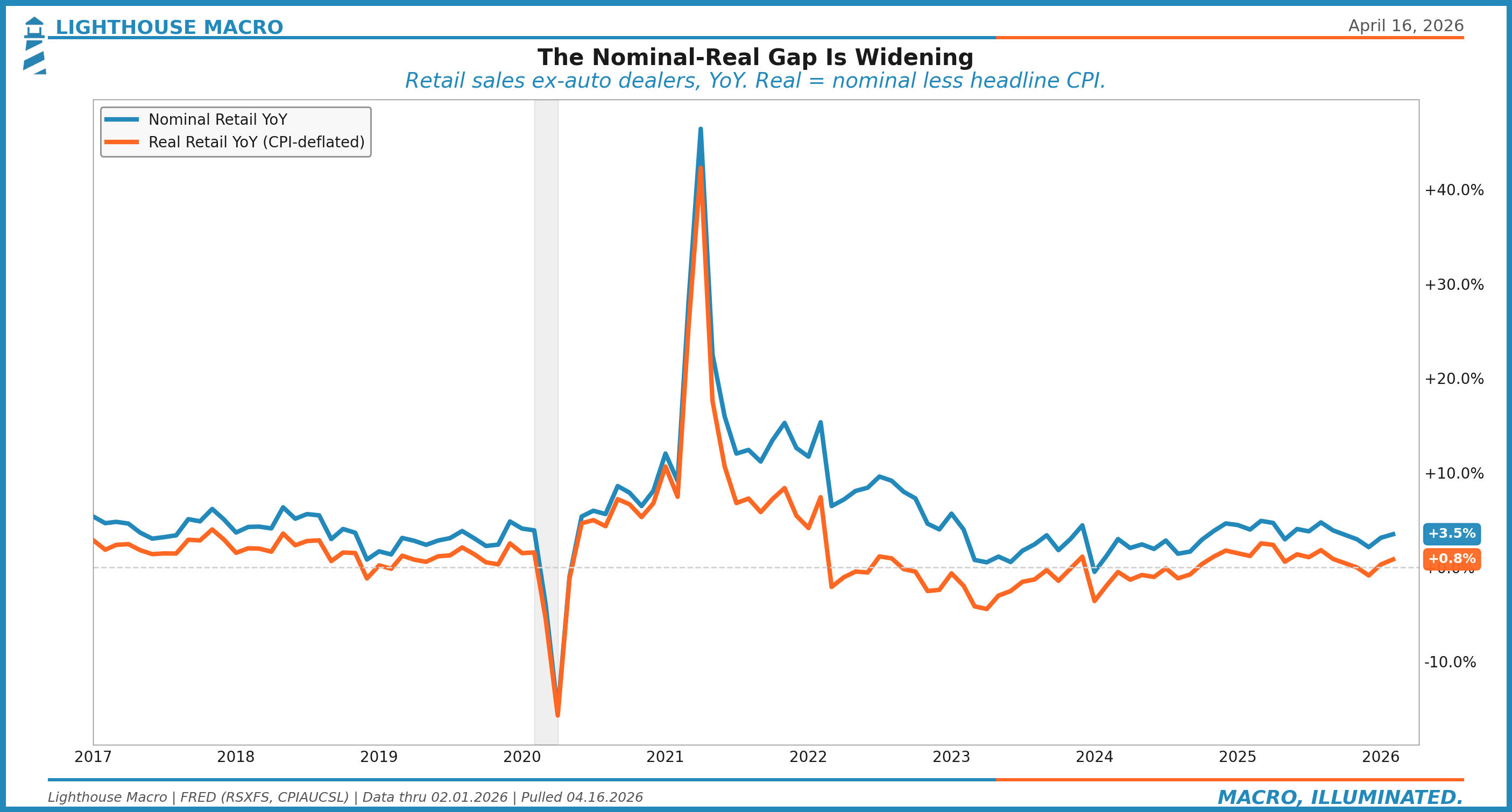 Credit agrees with equities, which is the uncomfortable part of the setup. High yield option-adjusted spreads closed April 14 at 284 basis points, through our 300 bps complacency threshold after peaking at 346 during the war. Spreads have tightened despite what’s underneath. Q4 2025 GDP was revised to 0.5% annualized. March CPI landed at 3.3% year-over-year, the highest print since April 2024. Real retail sales growth has halved from its early-2025 pace. February printed +0.8% YoY versus +2.5% last March, stalled in a +0.3% to +1.8% band for seven months now. Nominal spending keeps pushing higher. Real spending is barely breathing.