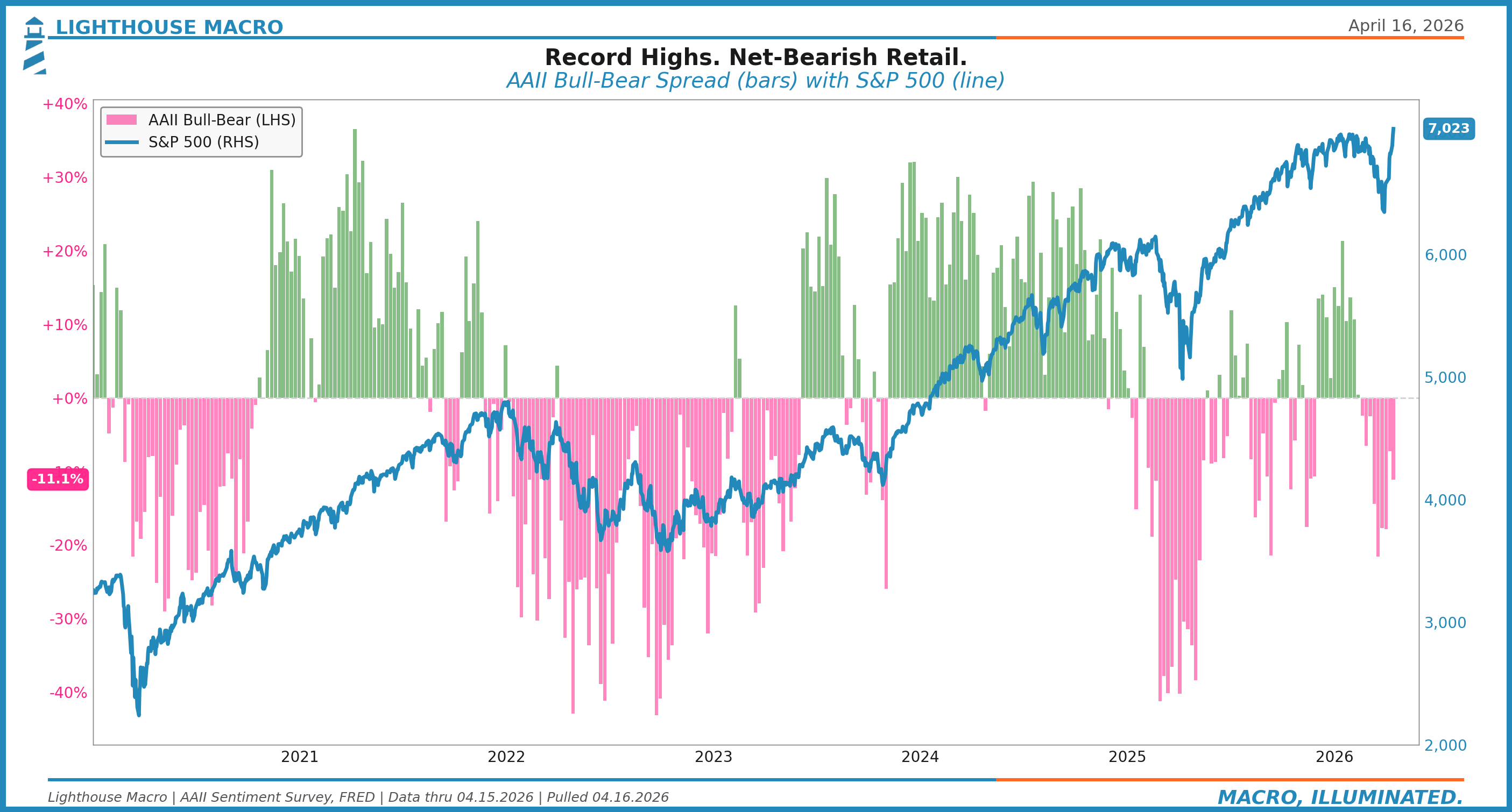 Here’s the contrarian twist worth sitting with. The AAII bull-bear spread for the week ending April 15 came in at minus 11.1%. Bulls 31.7%, bears 42.8%. The index is printing record highs and retail sentiment is more bearish than it was a week ago. Those two conditions almost never coexist. You usually get euphoria at tops. The wall of worry is still standing.